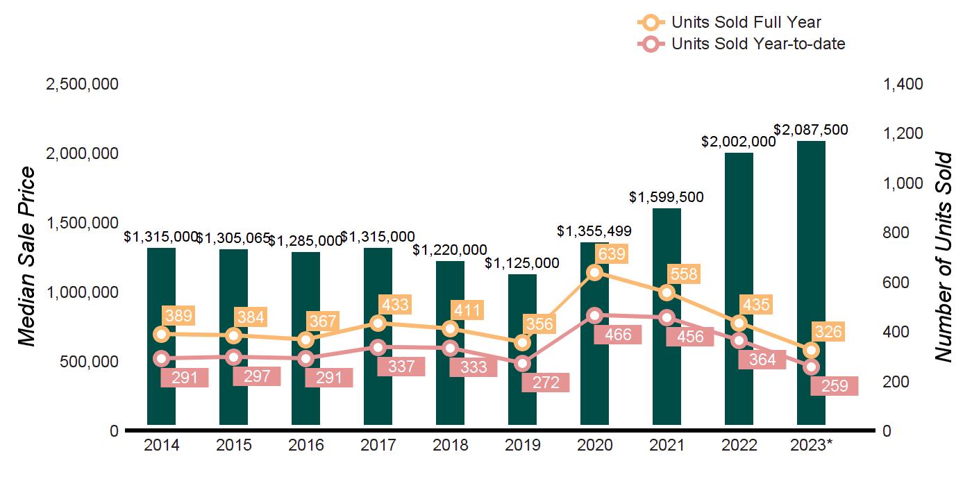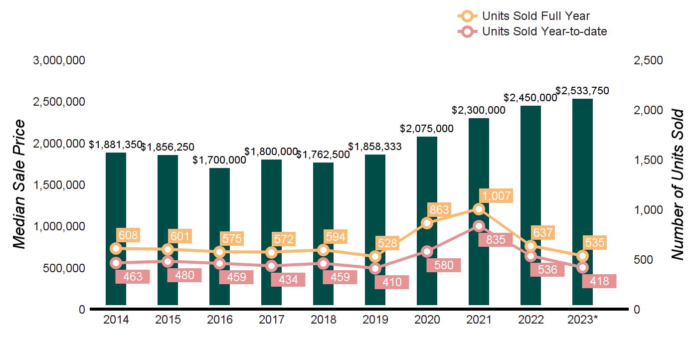 Q3 2023 Q3 2022 % CHANGE YTD 2023 YTD 2022 % CHANGE HOMES SOLD 111 131 -15.3% 259 364 -28.8% AVERAGE SALE PRICE $2,387,282 $2,428,907 -1.7% $2,434,194 $2,415,139 0.8% MEDIAN SALE PRICE $2,042,500 $1,999,000 2.2% $2,087,500 $2,050,000 1.8% AVERAGE PRICE PER SQUARE FOOT $553 $568 -2.6% $551 $564 -2.3% AVERAGE DAYS ON MARKET 47 51 -7.8% 54 53 1.9% % SALE PRICE TO LIST PRICE 102.6% 102.4% 0.2% 100.5% 103.2% -2.6%
