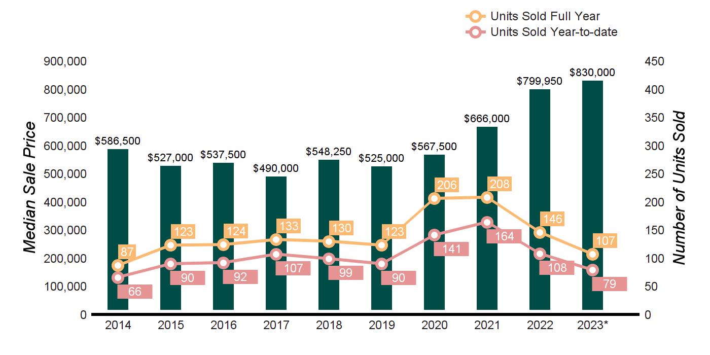 Q3 2023 Q3 2022 % CHANGE YTD 2023 YTD 2022 % CHANGE HOMES SOLD 14 23 -39.1% 29 53 -45.3% AVERAGE SALE PRICE $751,714 $638,869 17.7% $728,370 $698,838 4.2% MEDIAN SALE PRICE $635,000 $560,000 13.4% $635,000 $600,000 5.8% AVERAGE PRICE PER SQUARE FOOT $270 $265 1.9% $263 $304 -13.5% AVERAGE DAYS ON MARKET 80 55 45.5% 64 75 -14.7% % SALE PRICE TO LIST PRICE 98.3% 98.6% -0.3% 99.3% 96.7% 2.7%