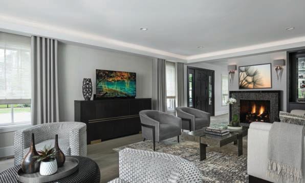 Crenshaw had wanted to incorporate a silver foil-style wallpaper and use amethyst drapes and accents, but because of supply-chain challenges and expenses, she went down a different, more resourceful design path. “I pulled from my inventory, and that started with yellow drapes; I had used them in a living room in another showhouse.” She added a Schumacher blackand-white trim to the drapes for pizzazz, and chose Benjamin Moore paints for the dentil crown molding (“a striking high-gloss black”) and the walls, which she cloaked in “a warm Alpine White.” Then, she selected accessories and decorative accents from Judy Frankel Antiques in Troy.