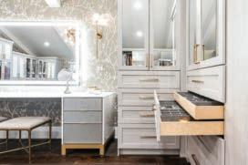 detail of this Dressing Room for a client in Northville was meticulously considered to accommodate her beautiful wardrobe. The combination of style, elegance and function make it a joy to spend time in. Complete with gold framed mirror doors, vanity on aluminum frame base, integrated ribbon lighting, a waterfall top island, and mixed styles of gold hardware though out the design. The Dressing Room utilizes nearly every accessory from tilt out laundry hamper to sunglass and jewelry organizers.