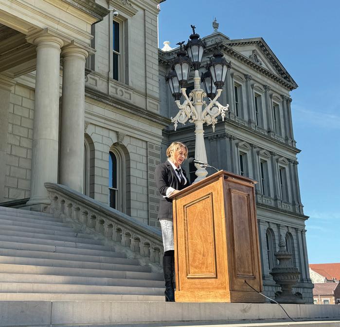 State Rep. Emily Dievendorf, D-Lansing, took to the east Capitol steps to speak to protestors.