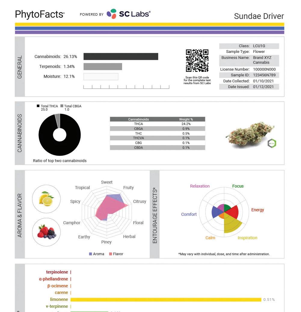 We continue the conversation about what makes quality cannabis on page 30 with SC Labs, which places strong emphasis on terpenes and terpenoids. Its chemometric reports identify dominant terps, aromas, flavors, and potential effects to help give brands a leg up on retail shelves.