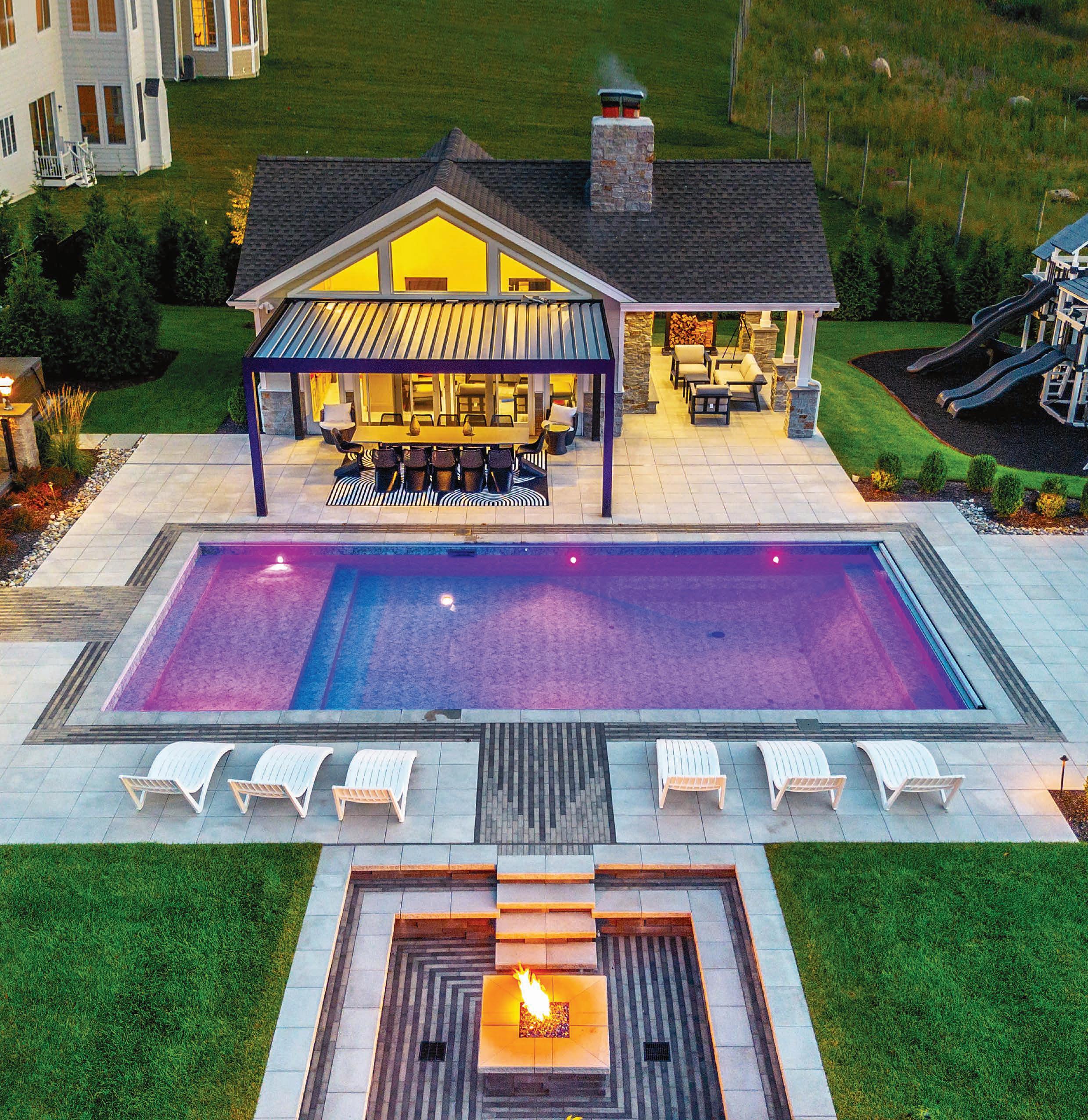 Natural stone is popular for the coping along the pool’s edge, McCool says, as well as darker finishes in the pool. A majority of SwimMor Pools & Spa customers are using a salt sanitation system and automated controls in their new pools, as well as choosing to add water features—waterfalls, fountains, deck jets and plenty more. The company also offers many in- pool fixtures for lounging—bar stools and benches that can tie into your outdoor kitchen or can run inside the pool, along with table areas, sundecks for your lounge chairs and custom fire features. Color LED lighting packcome with every pool, too.