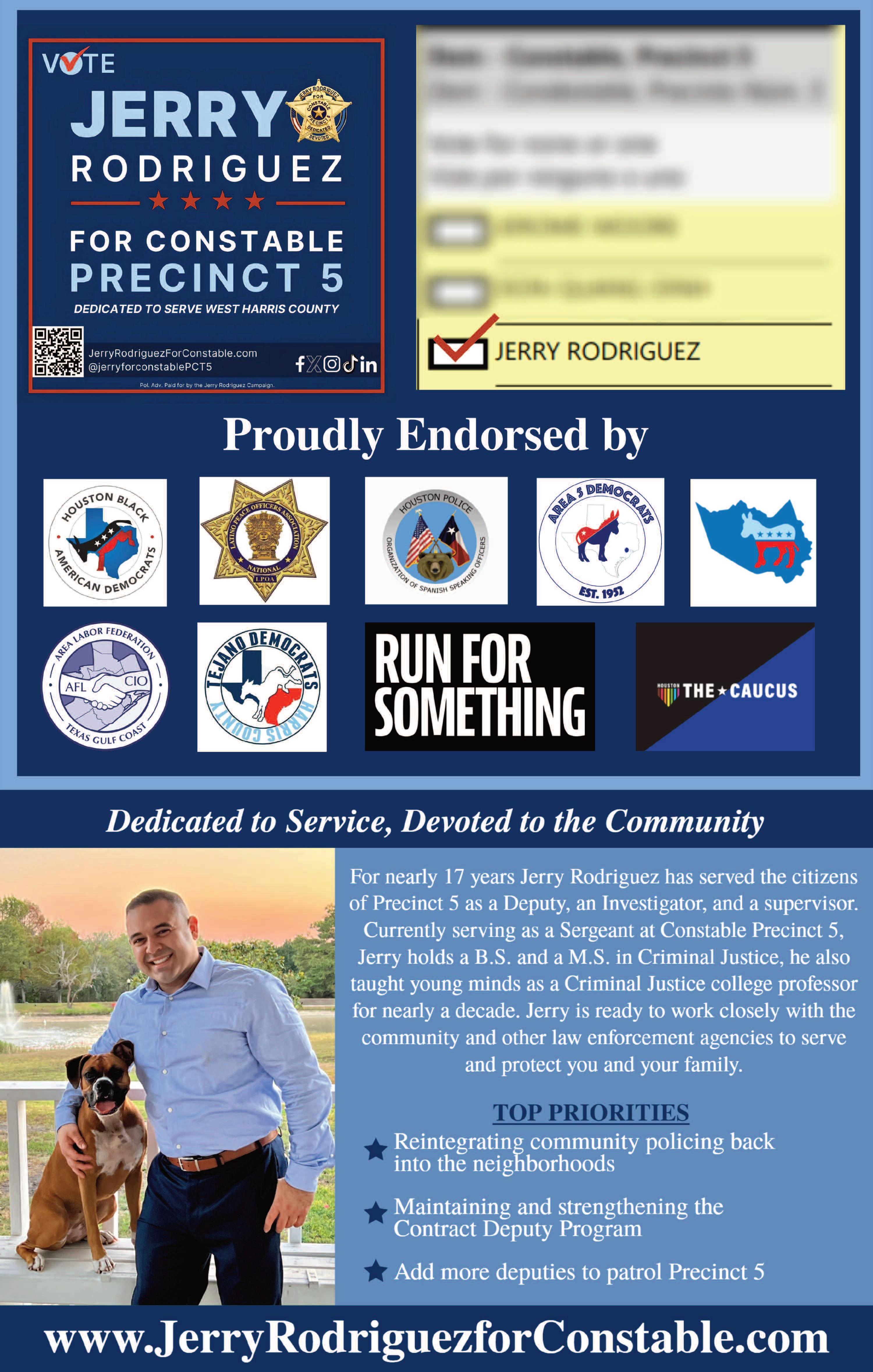 Currently serving as a sergeant at Harris County Precinct 5, Jerry is ready to continue on with his path in helping his community by stepping forward as your choice for Harris County Constable Precinct 5 Let's stand with Jerry and together we can pave the way to a brighter, better