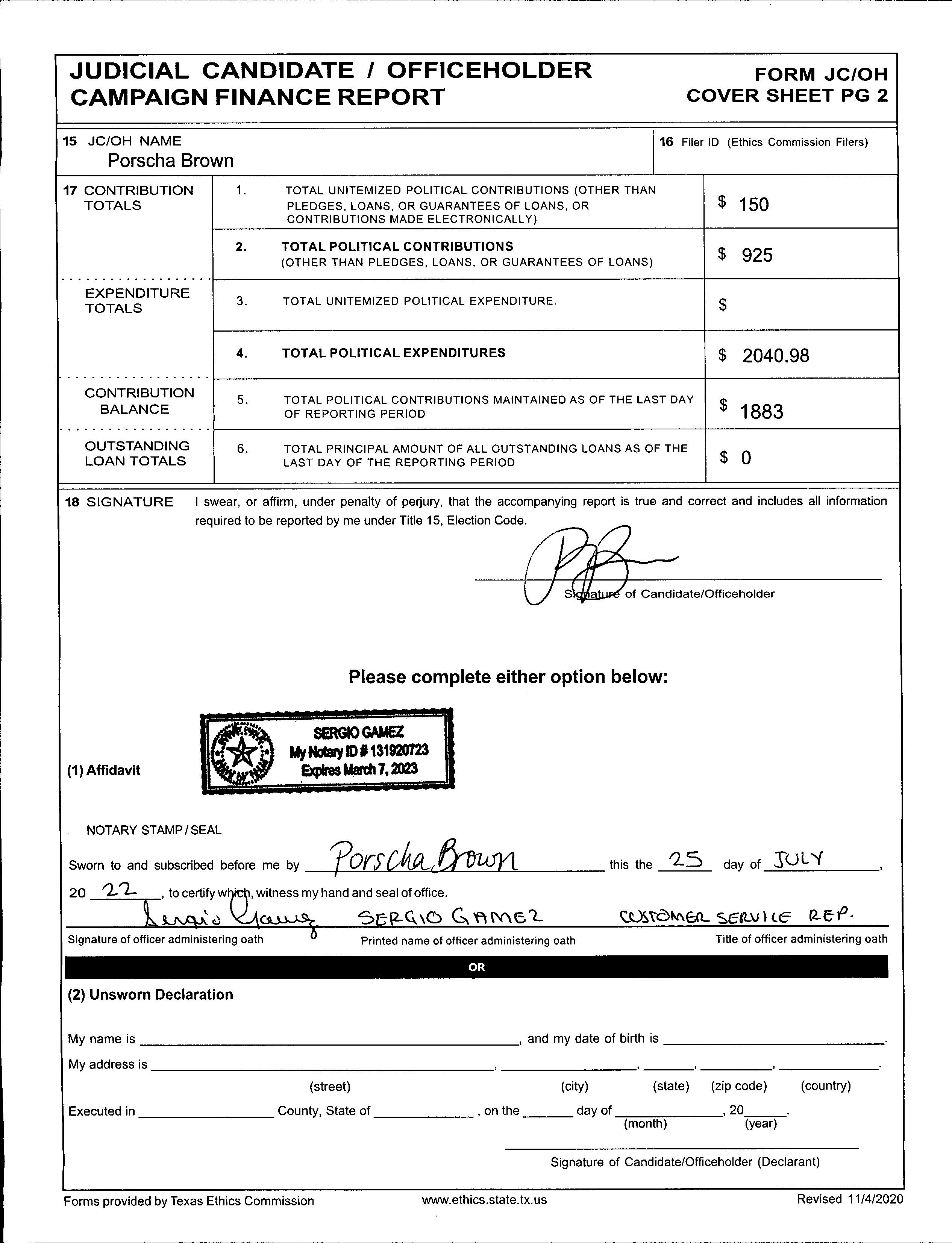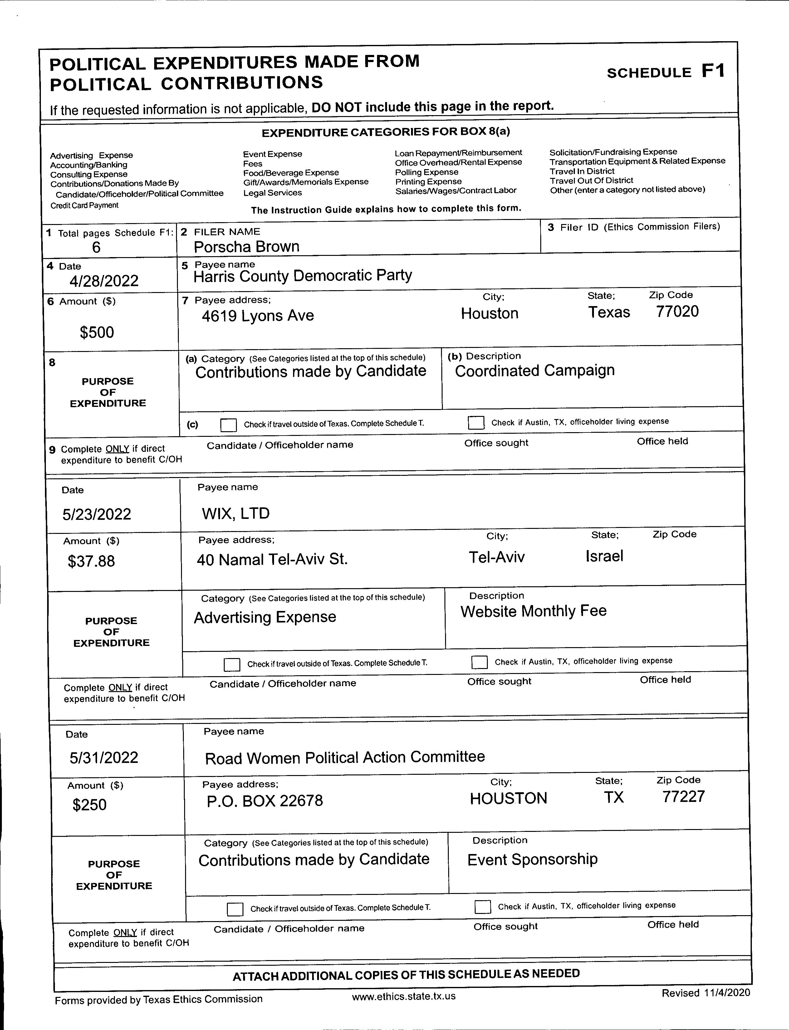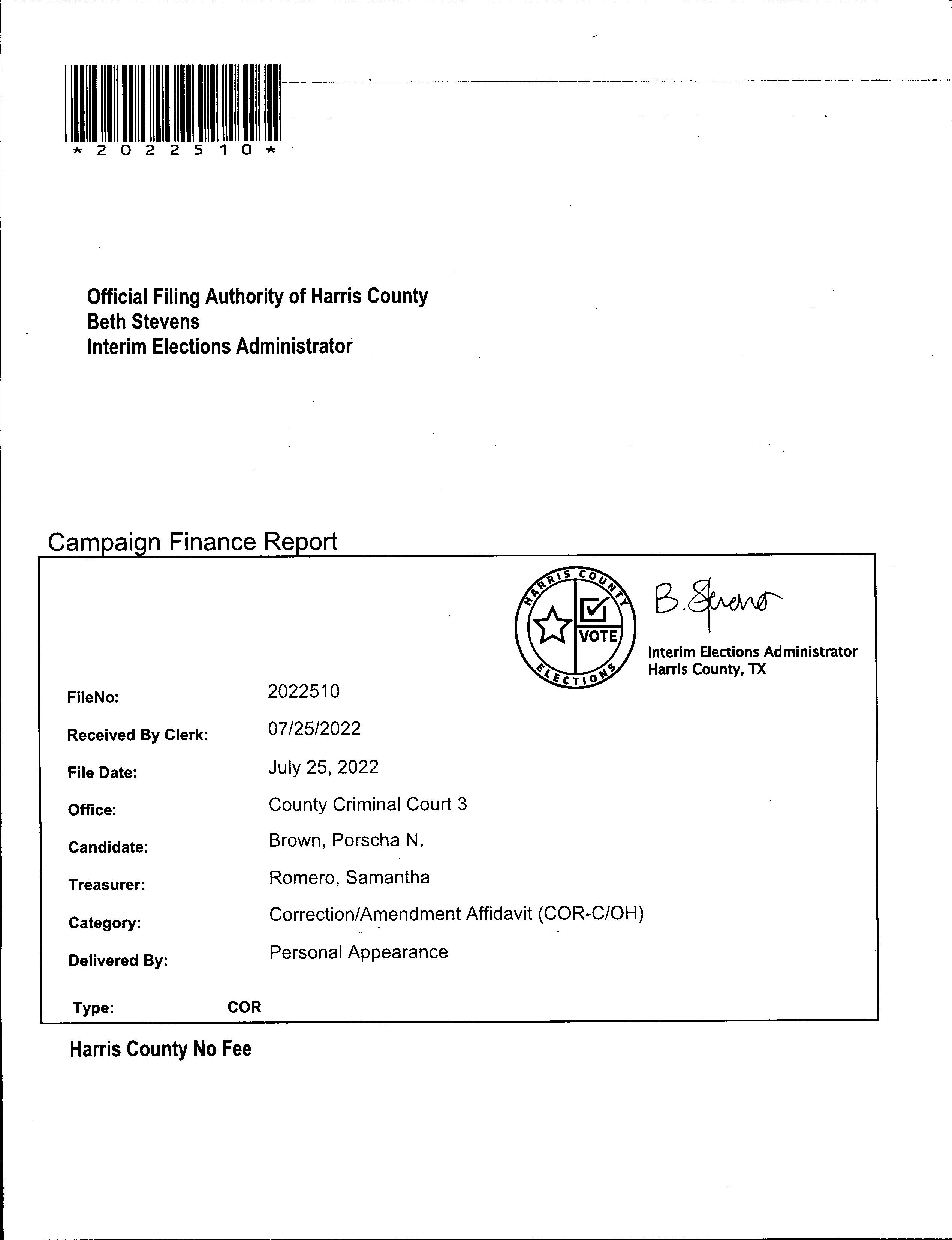 On July 25, 2022, Porscha Natasha Brown file this Campaign Finance Report