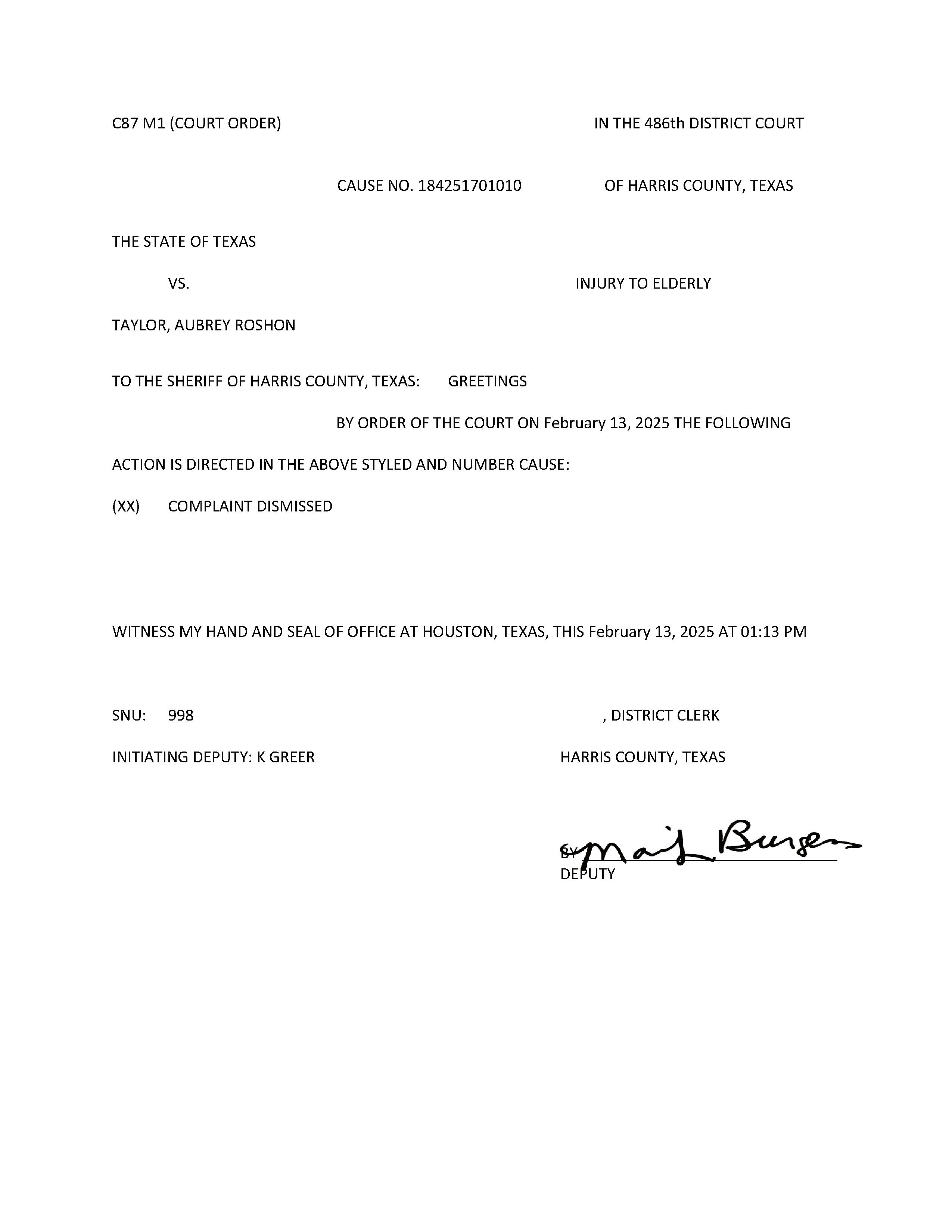 Complaint Against Aubrey R Taylor Dismissed by Order of the Court on February 13, 2025