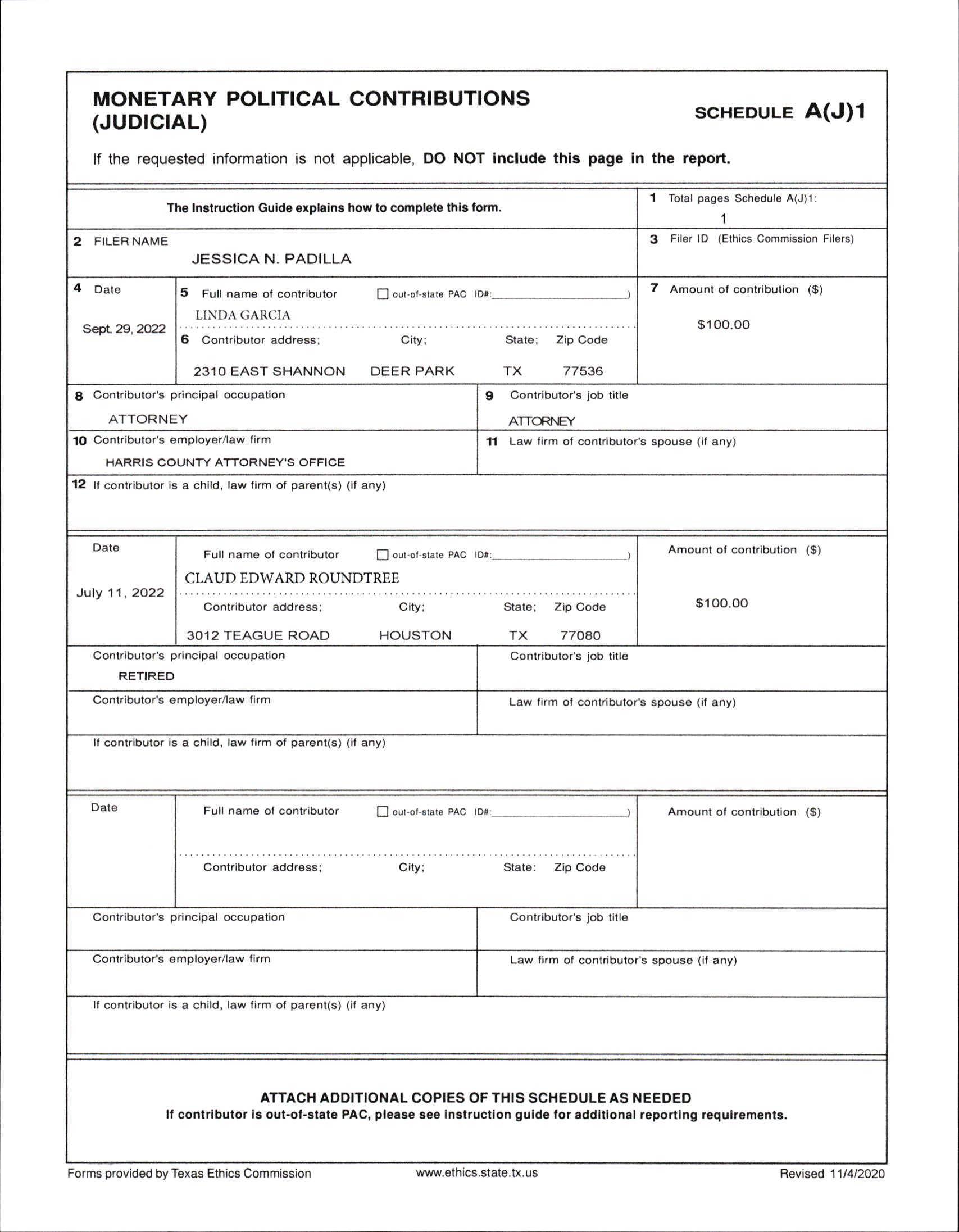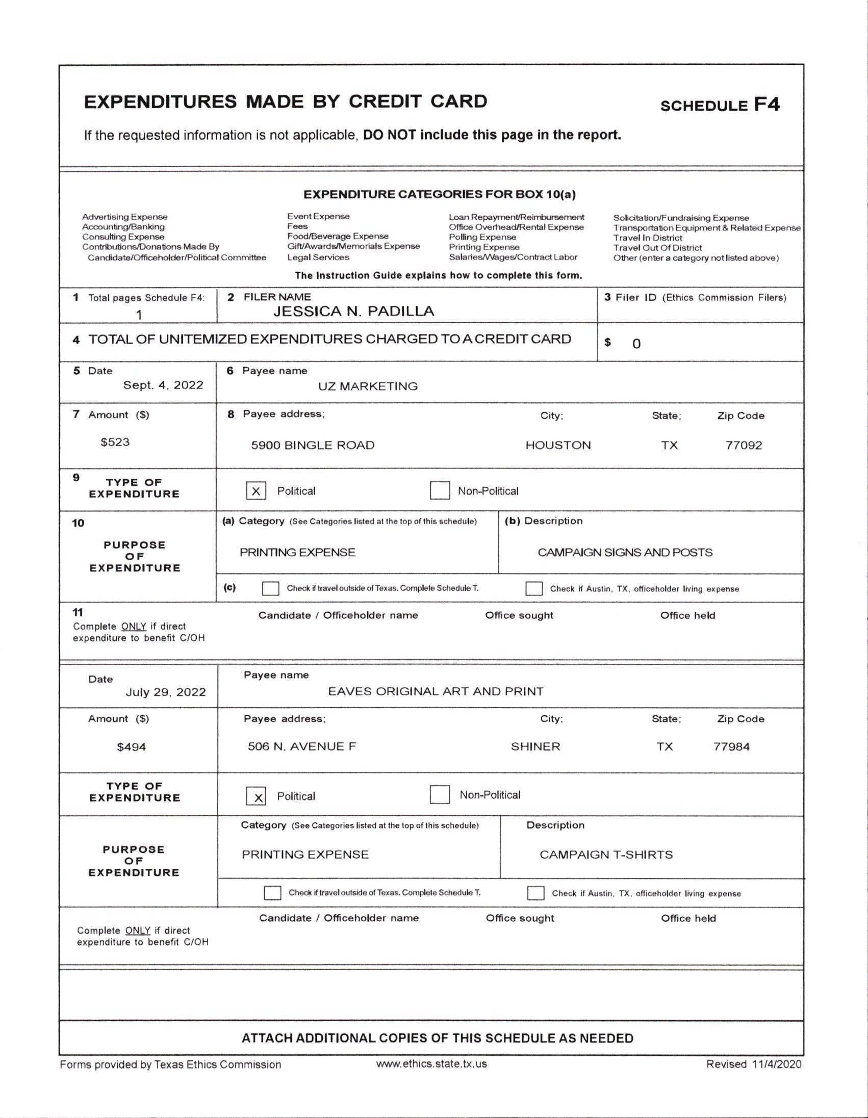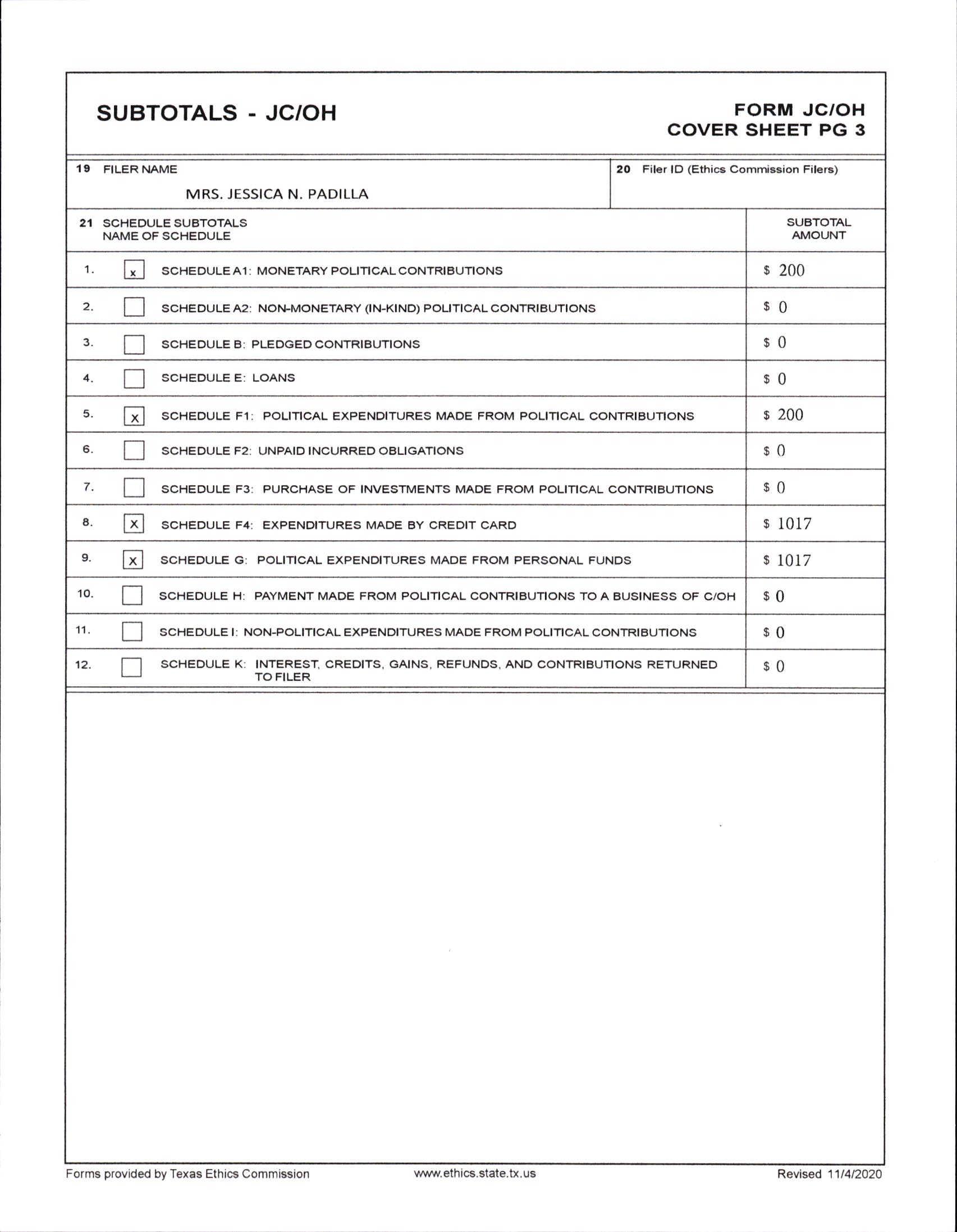 Jessica N Padilla, October 10, 2022 Campaign Finance Report Filing