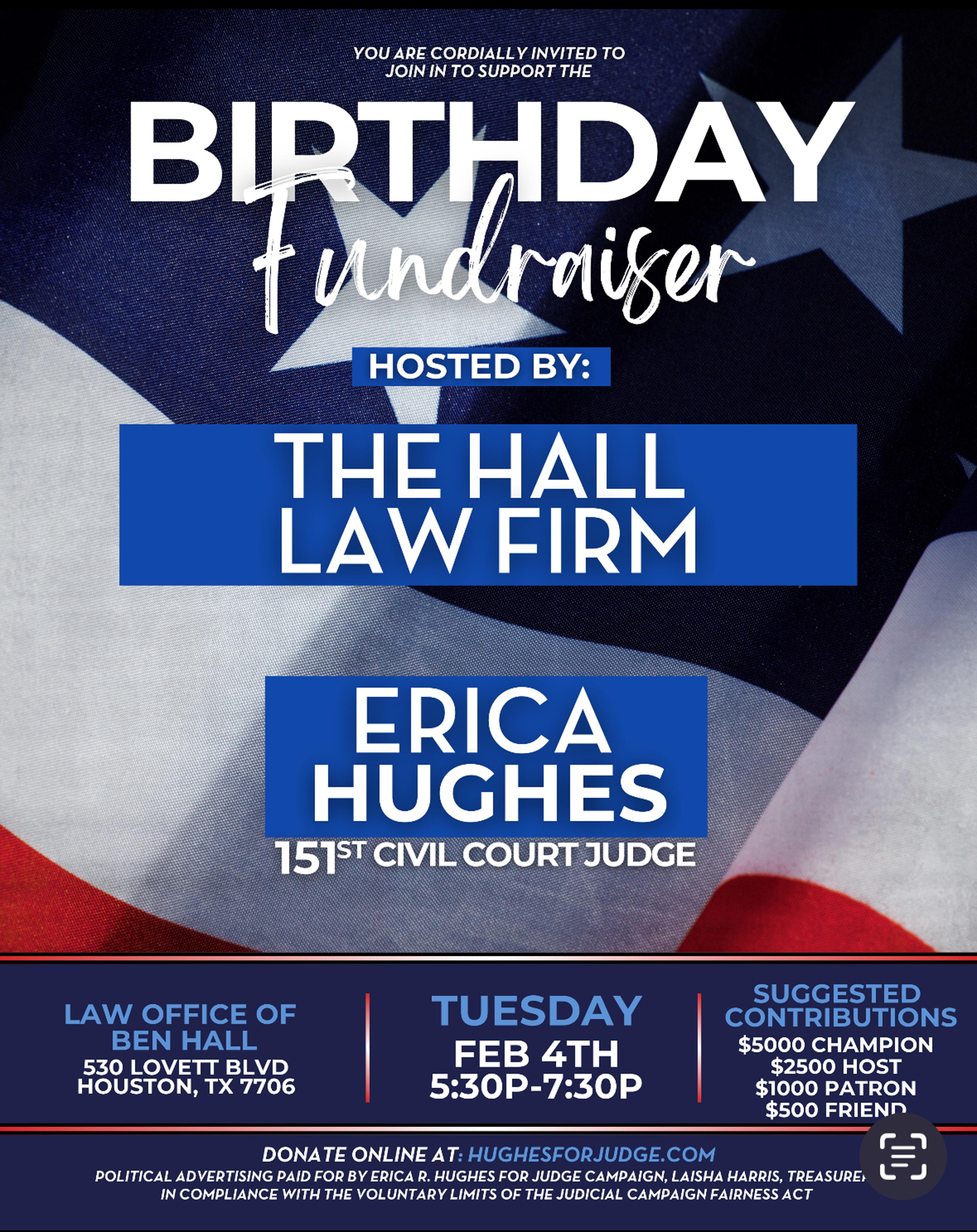 The Birthday Fundraiser for Judge Erica Hughes will kick off Black History Month at the Law Office of Ben Hall at 530 Lovette Boulevard, Houston, Texas 77006. Aubrey R. Taylor Communications publishes the Houston Business Connections Newspaper. All Rights Reserved.