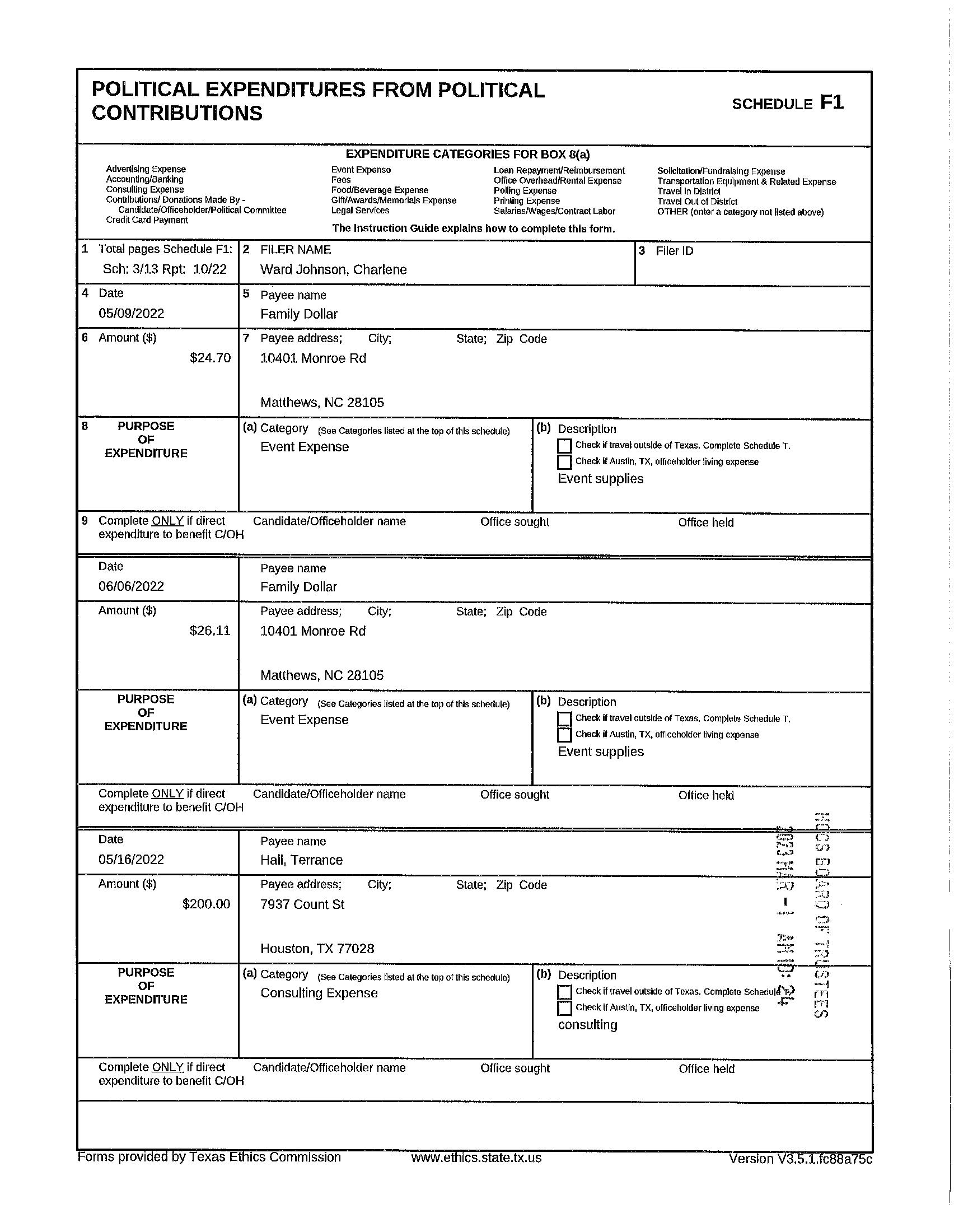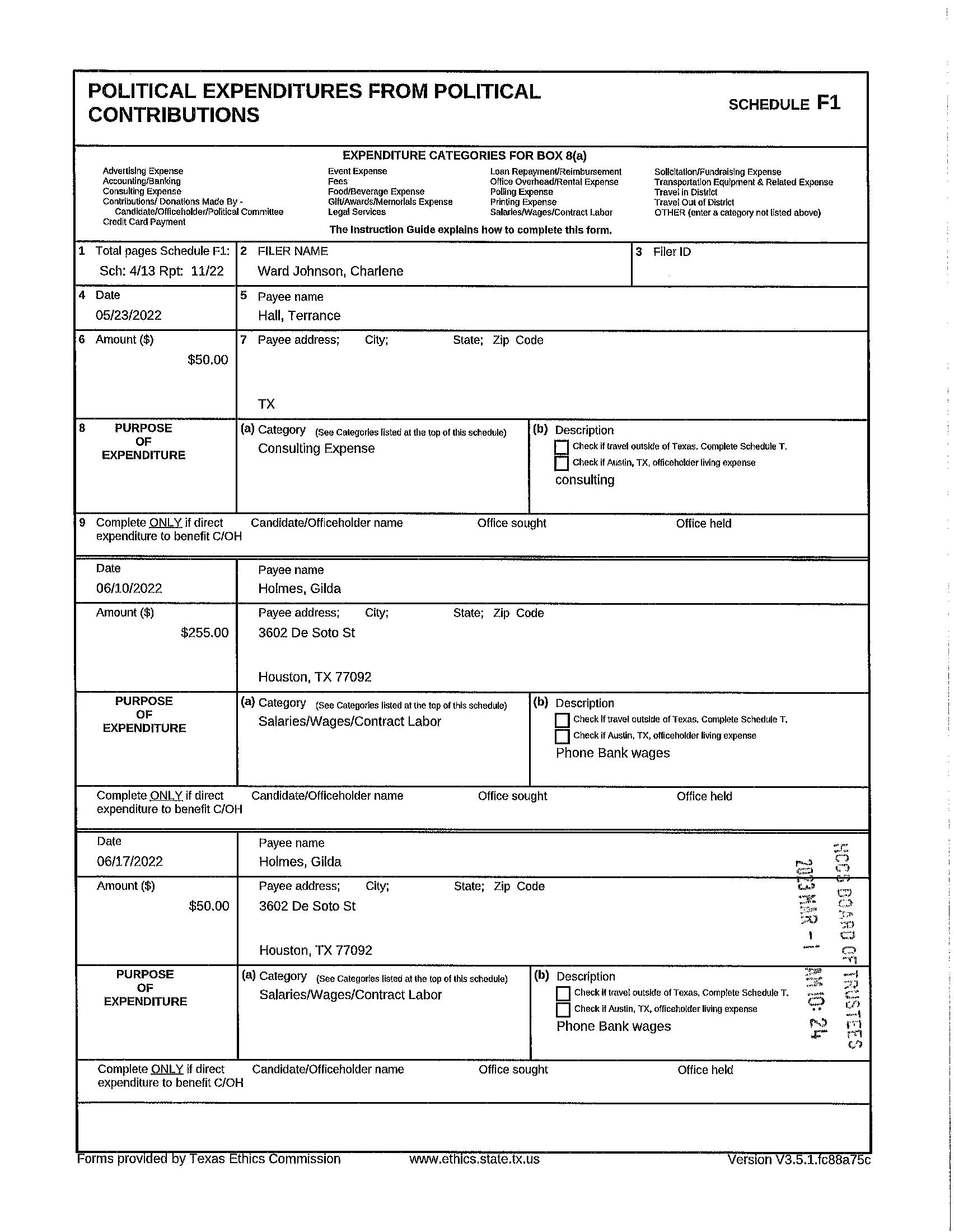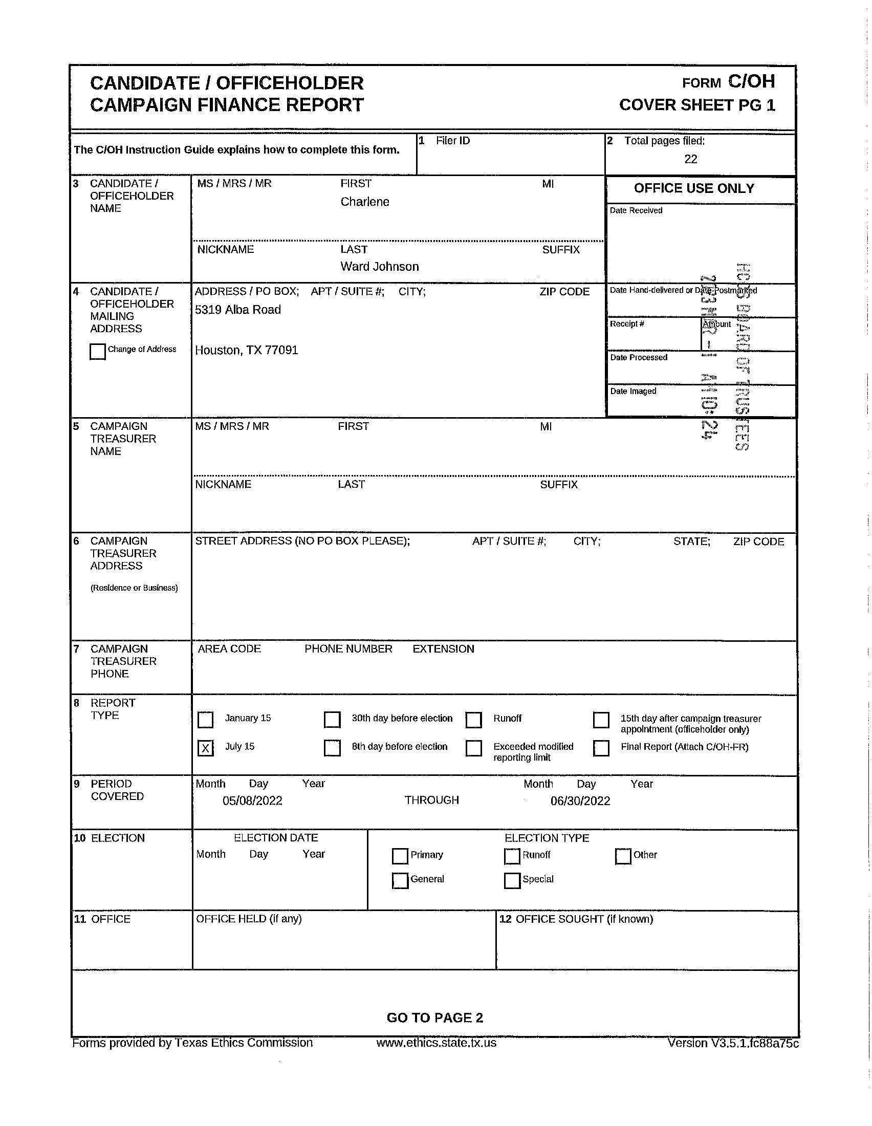 This campaign finance report was filed on Wednesday, March 1, 2023, by HCC Trustee Charlene Ward Johnson, to accurately reflect donations she had received from the Houston Business Education Coalition PAC, back during the 2022 reporting period. Aubrey R. Taylor Communications is the publisher of the Houston Business Connections Newspaper.