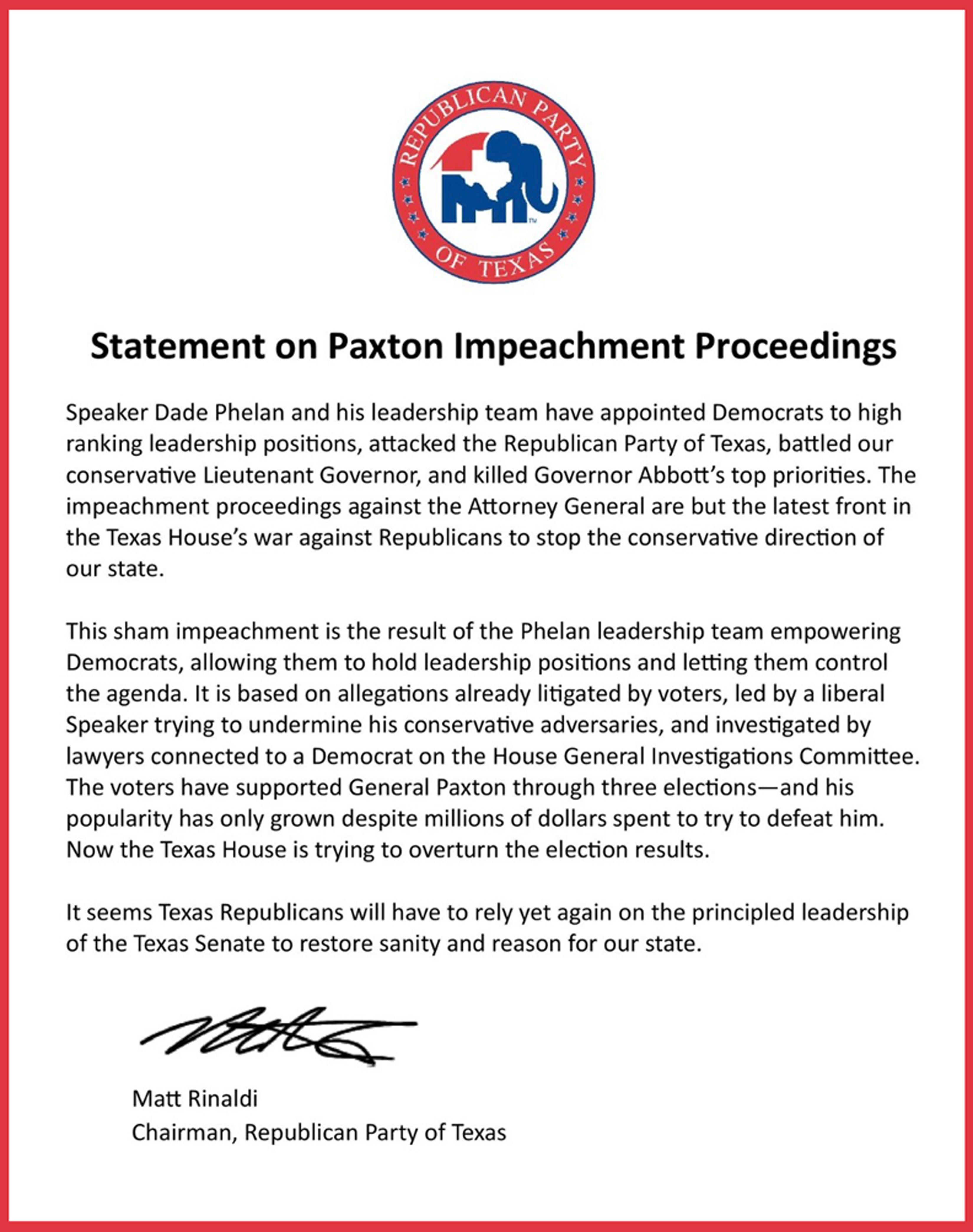 This is the statement that was released by Matt Rinaldi, the chairman of the Republican Party of Texas on the impeachment of Texas Attorney General Ken Paxton on Saturday, May 27, 2023. Aubrey R. Taylor Communications is the publisher of the Houston Business Connections Newspaper. All Rights Reserved.