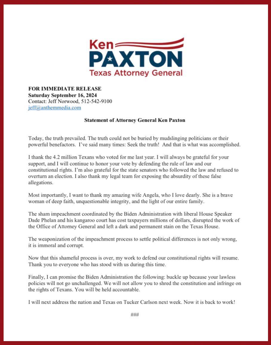Official message from Texas Attorney General Ken Paxton after he was acquitted on Saturday, September 16, 2023, of all impeachment charges that were brought against him. Aubrey R. Taylor Communications publishes Houston Business Connections Newspaper.
