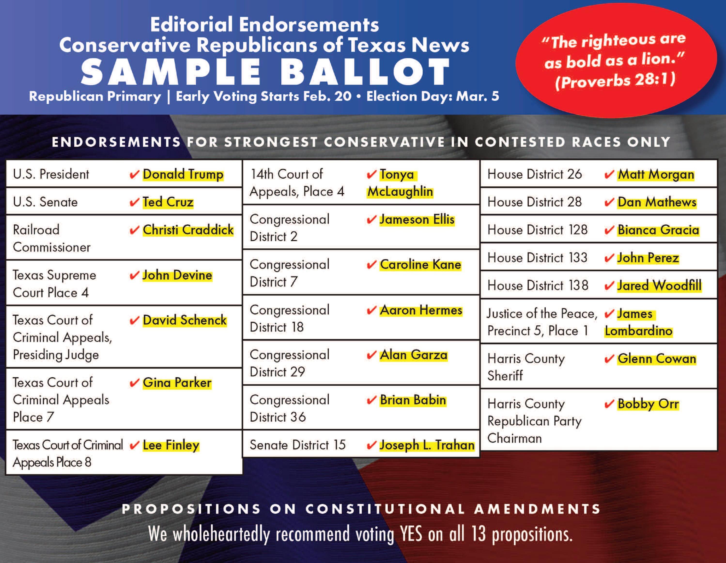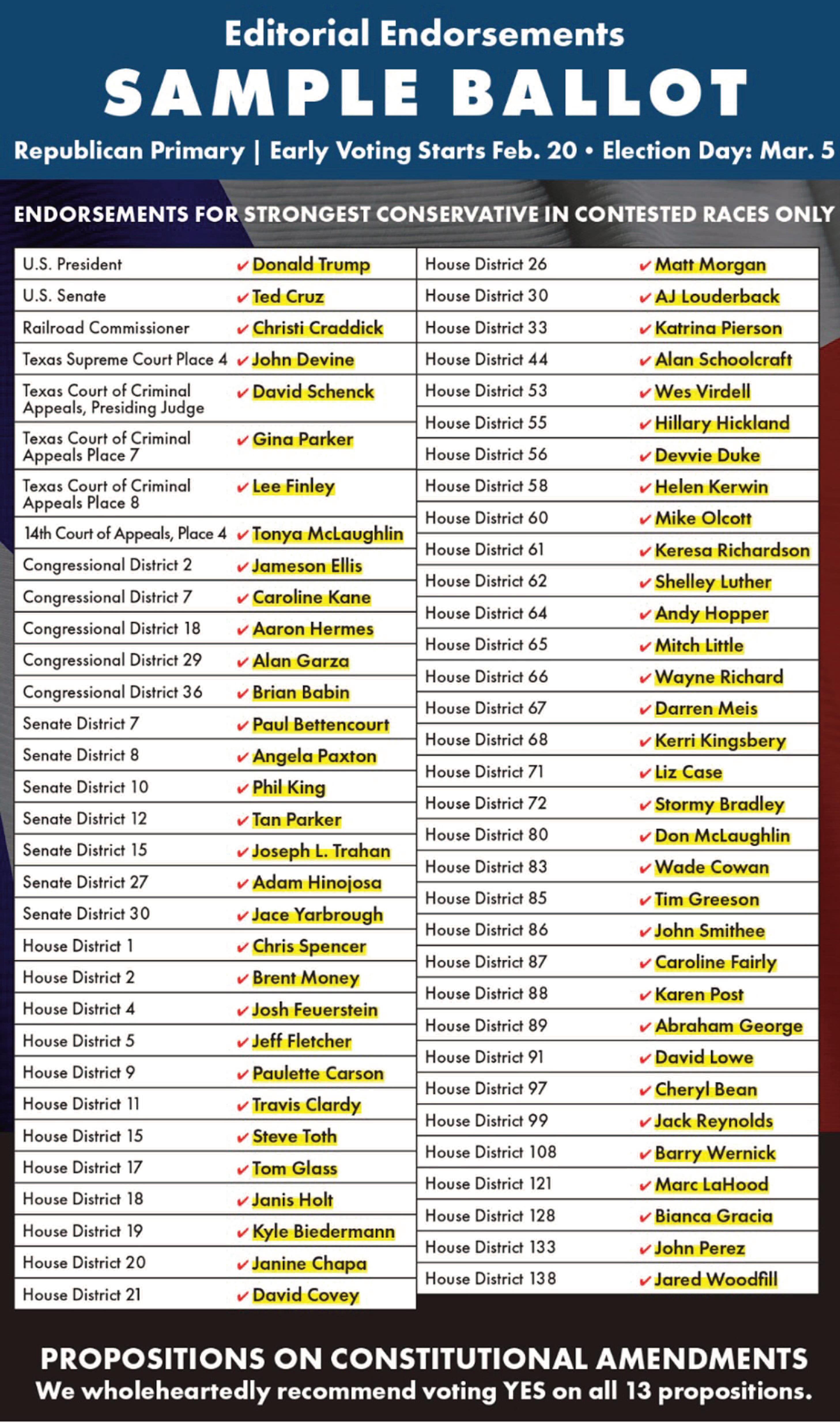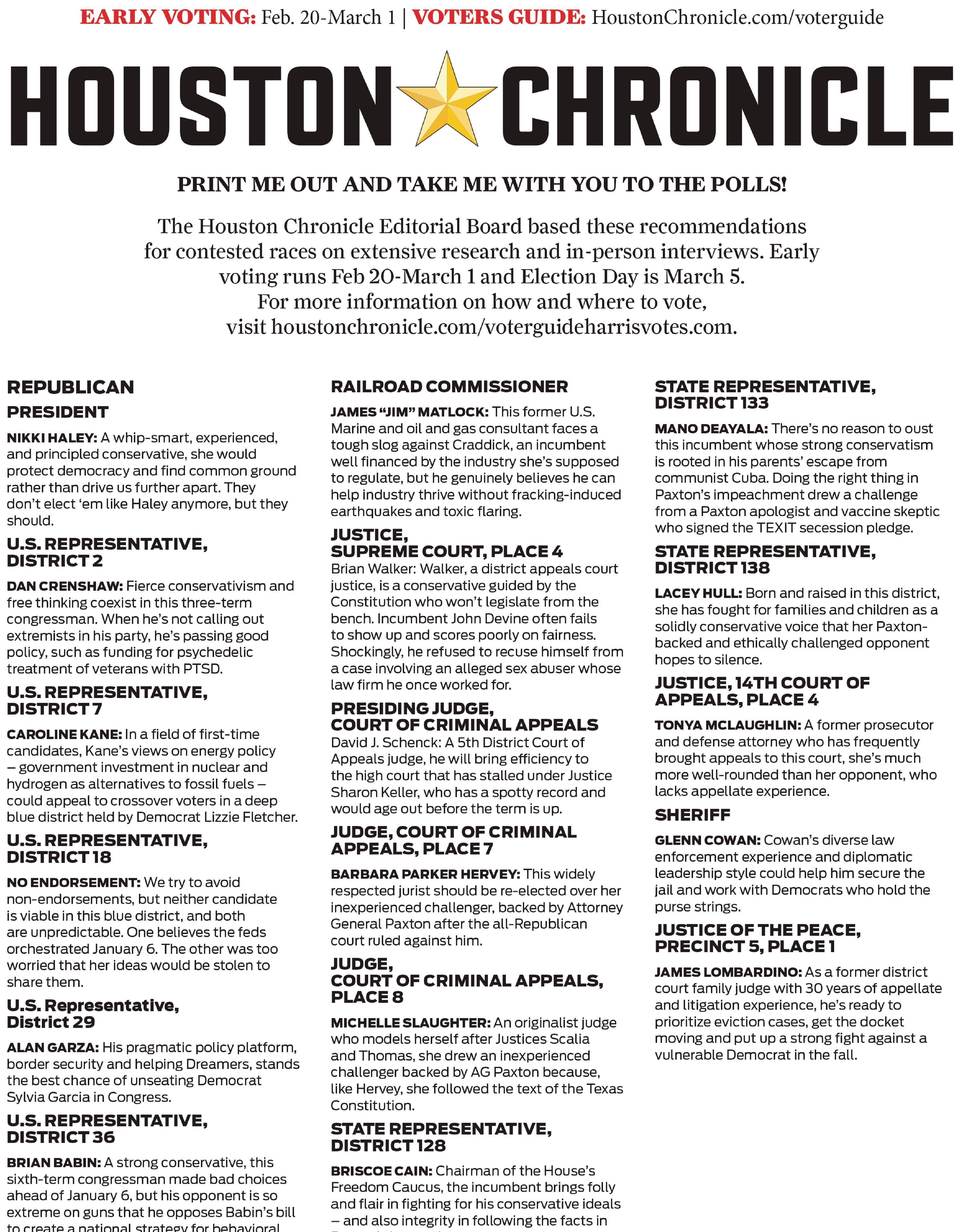 HOUSTON BUSINESS CONNECTIONS NEWSPAPER© SUPER TUESDAY - “DON’T FORGET TO VOTE ON TUESDAY, MARCH 5, 2024 ” 281 788 3033 © www.aubreyr taylor.blogspot .com “ I t ’ s i m p e r a t i v e t h a t w e m a k e i t o u r b u s i n e s s t o d o o u r o w n r e s e a r c h o n c a n d i d a t e s w h o a r e r u n n i n g f o r o f f i c e A l l w a r m - b l o o d e d A m e r i c a n s s h o u l d b e s u p p o r t i n g d u l y - q u a l i f i e d c a n d i d a t e s w h o b e l i e v e i n o u r U n i t e d S t a t e s C o n s t i t u t i o n a n d t h e l a w s t h a t g o v e r n u s a s a F R E E N AT I O N a s G o d ’ s p l a n f o r A m e r i c a c o n t i n u e s t o u n f o l d ” “ENDORSEMENT DIRECTORY.” HOUSTON CHRONICLE - P.6 I CRTX NEWS - P.10 I HBAD - P.12 I THE CAUCUS - P.14 © 281 788 3033