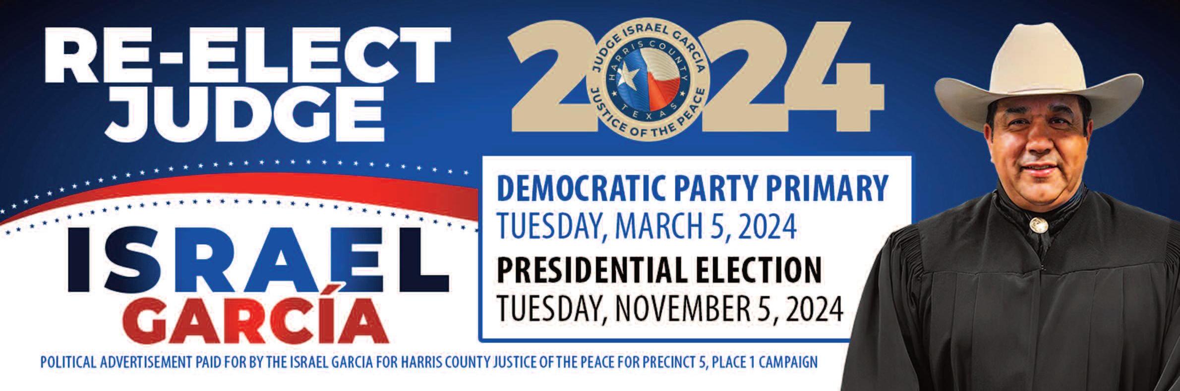 HOUSTON BUSINESS CONNECTIONS NEWSPAPER© SUPER TUESDAY - “DON’T FORGET TO VOTE ON TUESDAY, MARCH 5, 2024 ” M MENT The JOIN THE MOVEMENT: All open-minded Houston Business Connections Newspaper readers are strongly encouraged to cast their vote to re-elect Judge Israel Garcia on Tuesday, November 5, 2024, in the race for Harris County Justice of the Peace for Precinct 5, Place 1 ENDORSED “2024 DEMOCRATIC PARTY PRIMARY.”