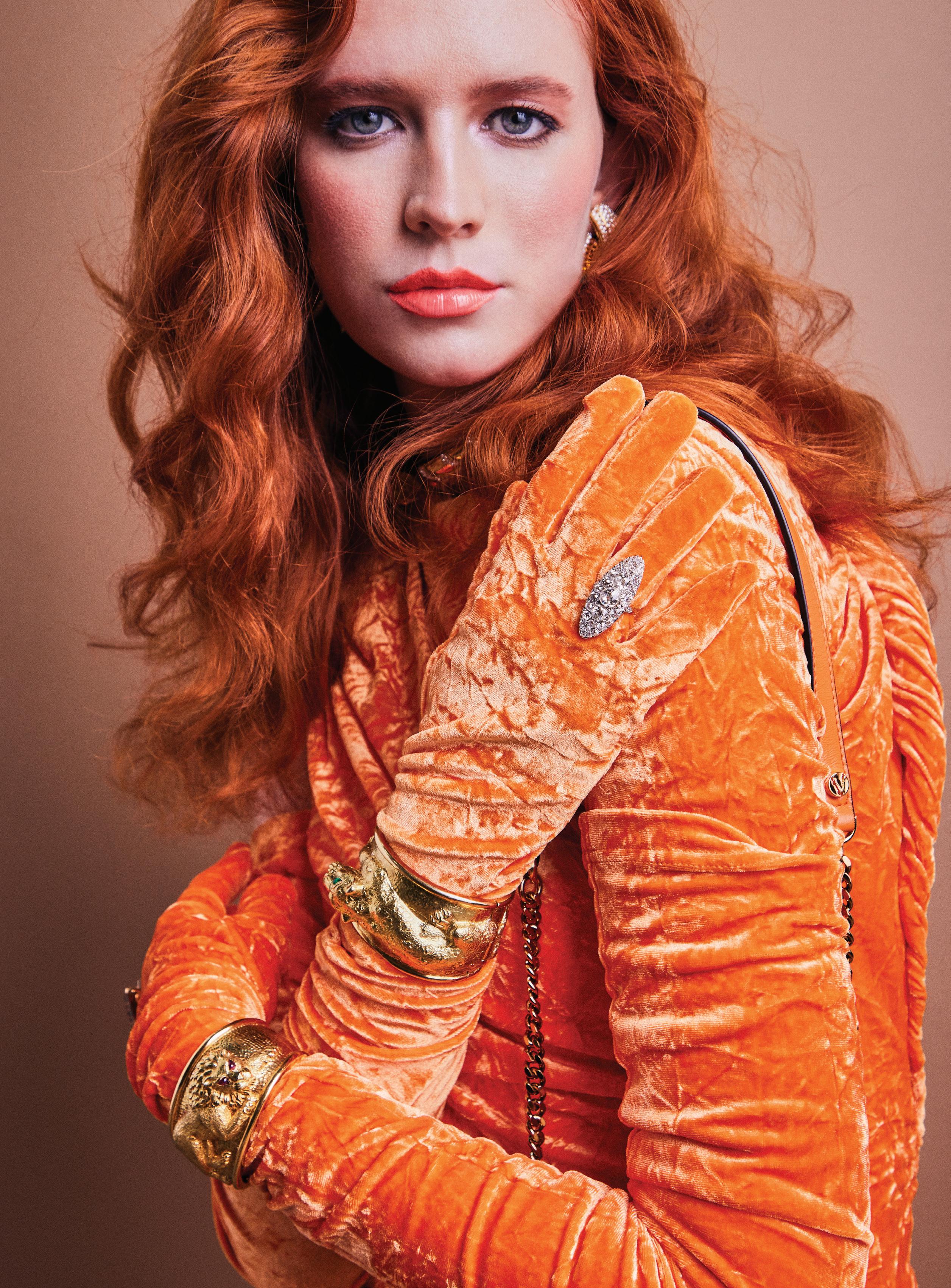 As fate would have it, one of the gowns photographer Samantha Jane Beatty had already shot for our fashion and jewelry cover spread was an orange and blue number by Delpozo. What are the odds? Somehow, miraculously, we had a great image of a model in a fabulous gown — in ’Stros colors!