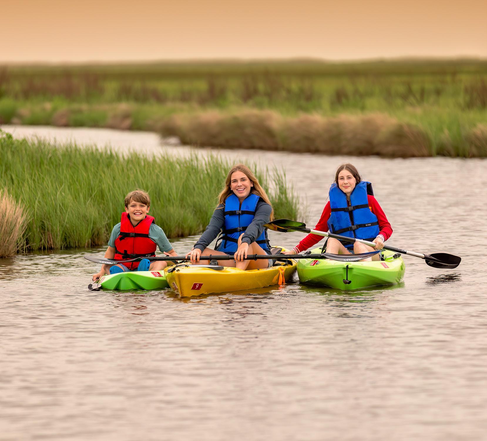 While you are there, try your hand at kayaking through the marshes on one of the beginner, intermediate or expert water trails. Looking for a real experience, why not plan on spending the night on the FLOATING PRIMITIVE CAMPSITE ! For only $15 a night, you & your family (Max 4 People) can boat or kayak 2 miles out to the campsite