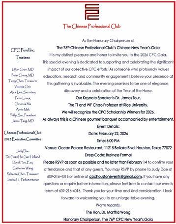 Houston’s Lunar New Year season gallops into joyful celebration as the Chinese Professional Club (CPC) hosts its 76th Annual Spring Festival Gala on Sunday, February 22, 2026. This cherished local tradition honors culture, community leadership, and academic excellence — and continues a legacy of engagement that began in 1950 when CPC was founded as the Chinese University Club to bring professionals and students together in fellowship, professional development and service.
