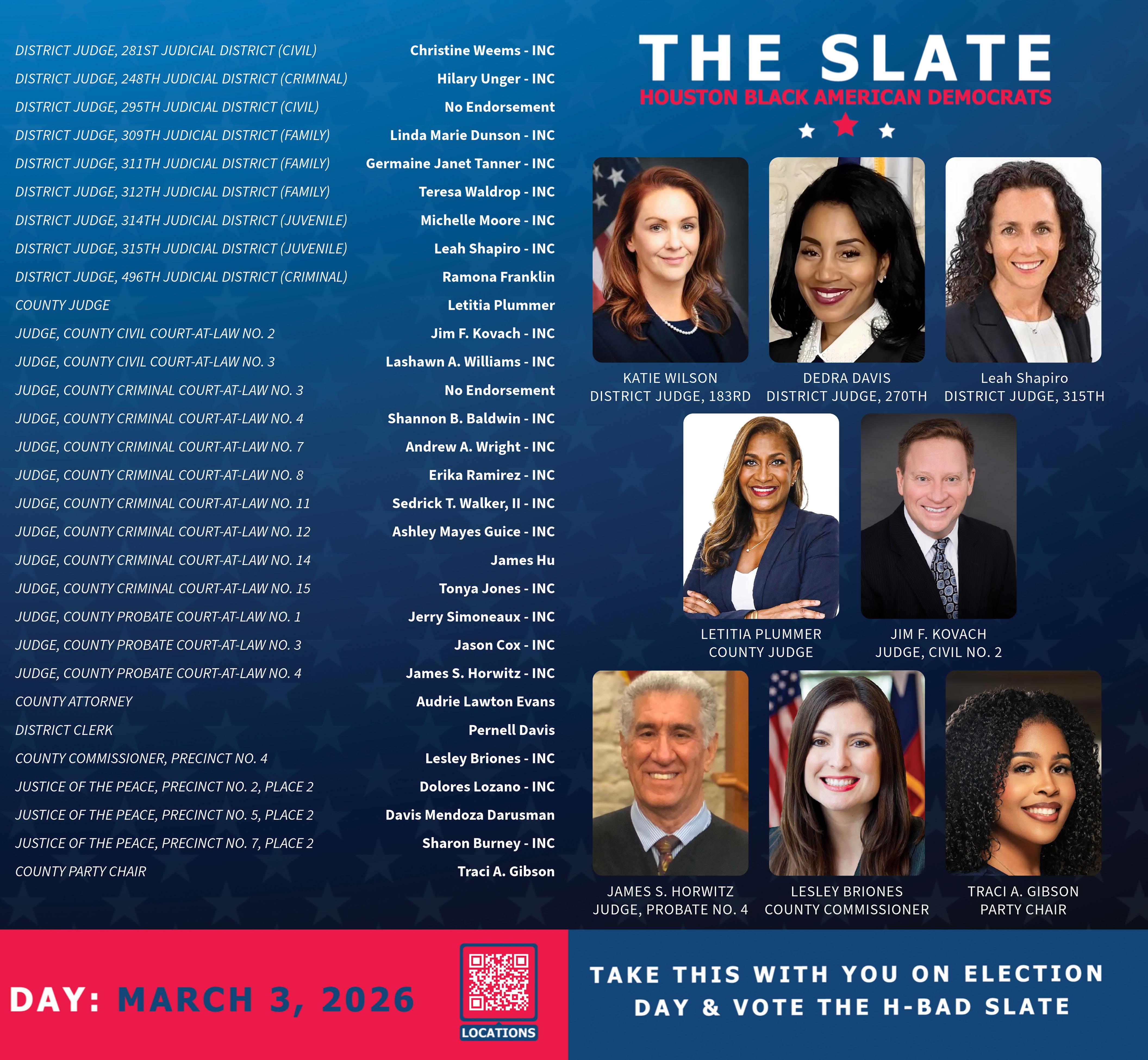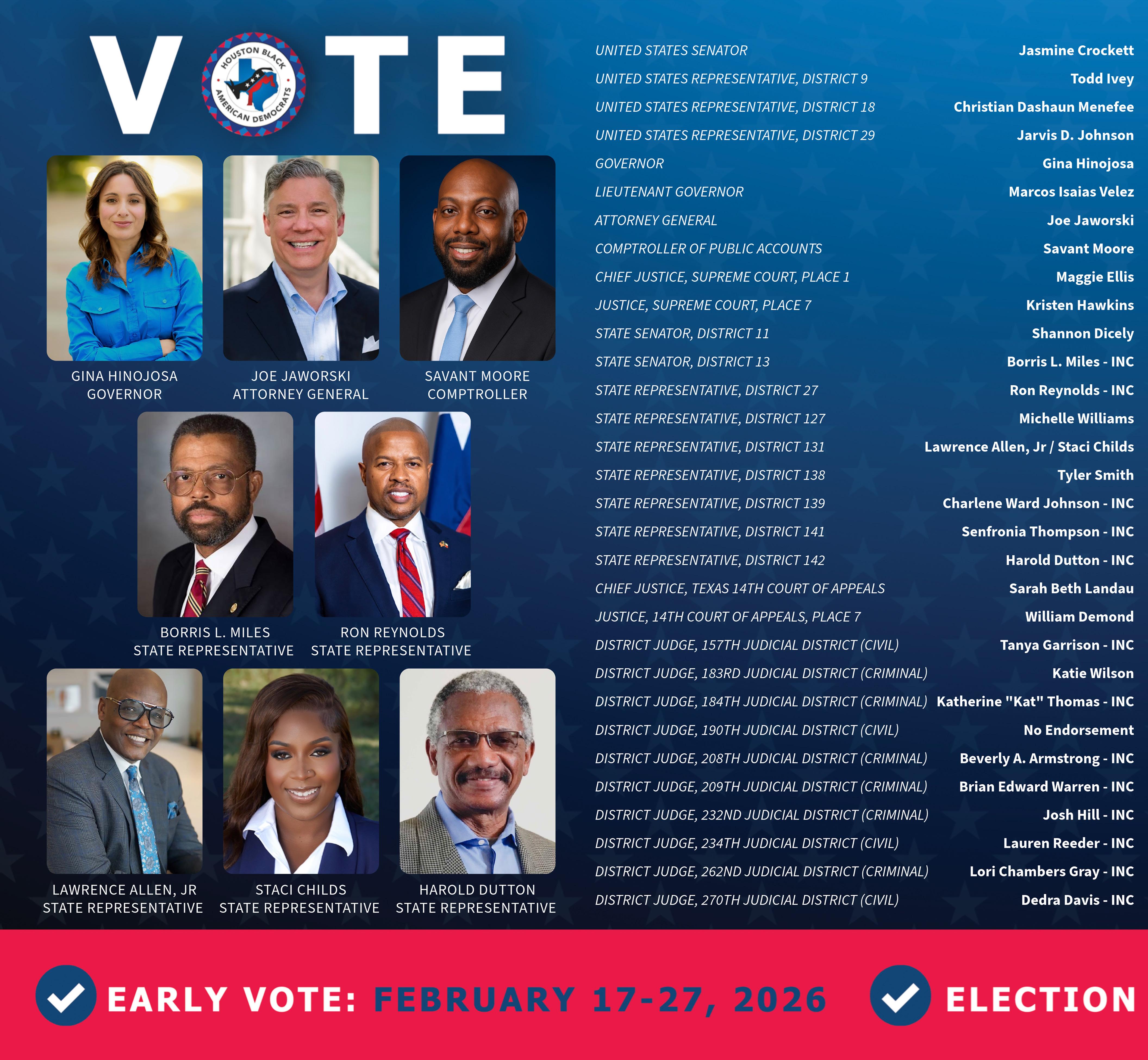 This year’s ballot is packed with high-profile contests that will shape leadership at every level of government, including races for the U.S. Senate and U.S. Congress, the Governor of Texas, Harris County Judge, and Fort Bend County Judge. Voters are also weighing in on key State Representative and State Board of Education seats, along with multiple County and District Clerk positions that play critical roles in the day-to-day operations of local government.