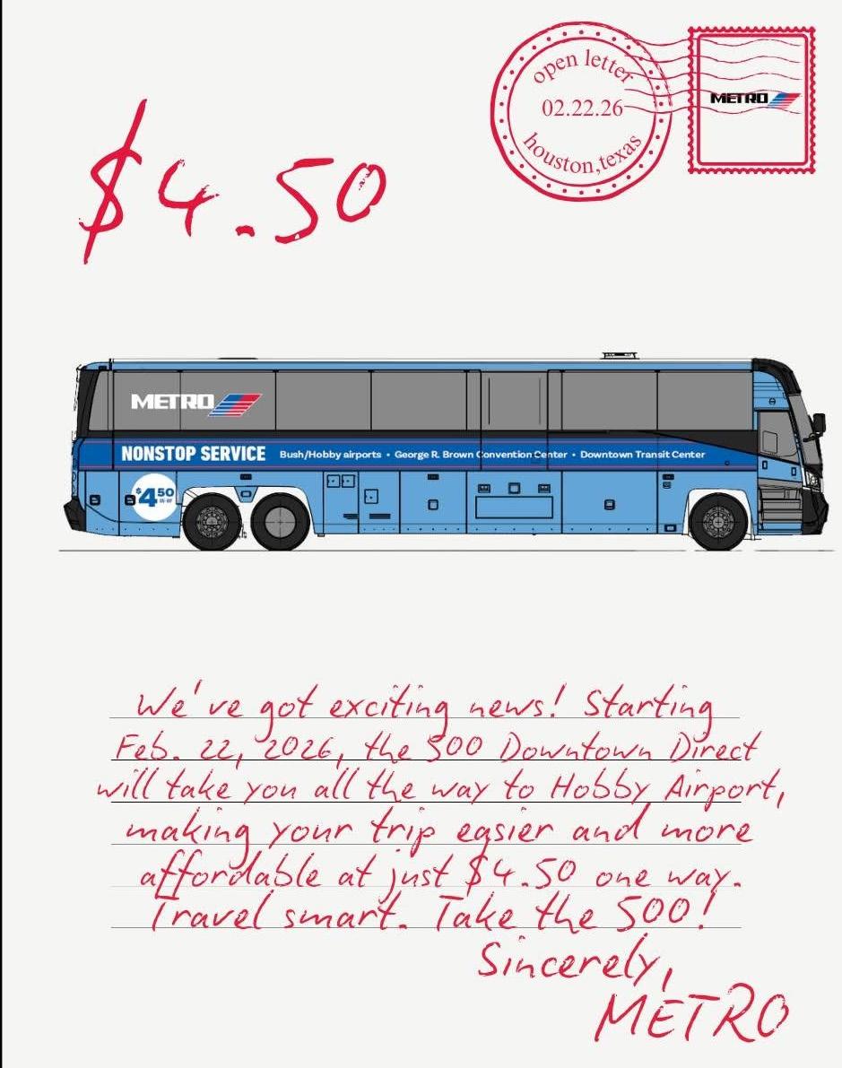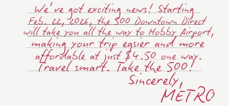 Beginning Sunday, February 22, METRO’s expanded 500 Downtown Direct route officially raised the bar for affordable airport transportation in Houston. At just $4.50 per ride, travelers can enjoy a fast, reliable connection between Downtown Houston and Hobby Airport — no surge pricing, no parking garage maze, no stress.