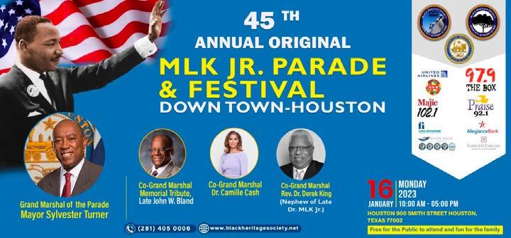This year, the Black Heritage Society has selected Houston Mayor Sylvester Turner to serve as Grand Marshal. The Co-Grand Marshals are Rev. Dr. Derek King, nephew of Dr. MLK Jr., Dr. Camille Cash, Houston Plastic Surgeon; and a Memorial Tribute to the Late John Bland!
