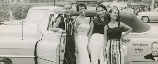 Four young women standing beside a convertible automobile, ca. 1958.