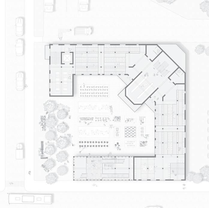 The rst oor is designated as packaging and o ce areas, while the second and third oors are mainly used for controlled circulation plant cultivation systems. On the south side of the building, a greenhouse is built next to the woodland rest area on the left side of the site to combine with the market. An open and semi-open environment is formed around the central planting area to grow seasonal vegetables.