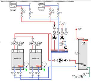 U sklopu rješenja s centraliziranim grijanjem i hlađenjem možete kombinirati različite sustave, npr. plinski kondenzacijski kotao i dizalice topline zrak-voda. Pohrana energije i CNUS Hoval Supervisor osiguravaju najbolju suradnju i uštedu energije.