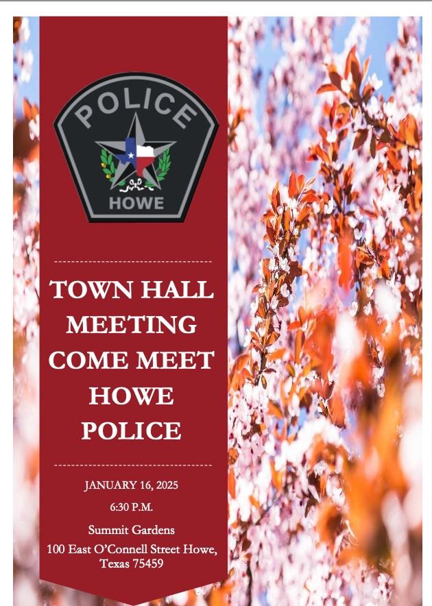 JANUARY16:PoliceDepartmentTownHallMeetingat6:30atSummitGardens,100E.O’ConnellSt.,Howe,TX