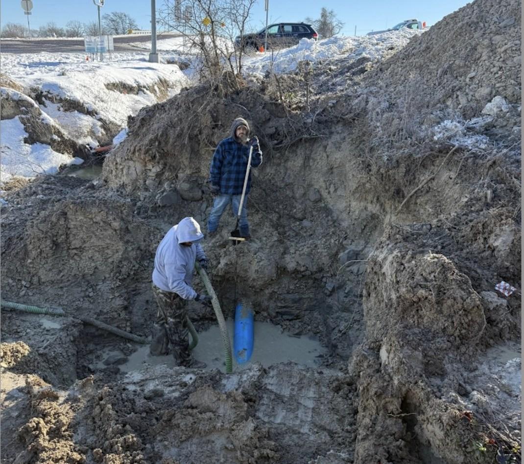 Assoonasthelocation ofthecreekwasfound, crewsbegantodig.JustinJohnson,Department HeadofPublicWorks, statedthecrewwas comprisedofhimself, JerryDavis,Afton Yealock,ZachMonk, DaltonDoss,andMichaelBarham.Thecrew workedfrom8a.m. Thursdayto12:30p.m. Saturday,diggingovernightinfrigidtemperaturesallthroughThurs(Continued on page 9)
