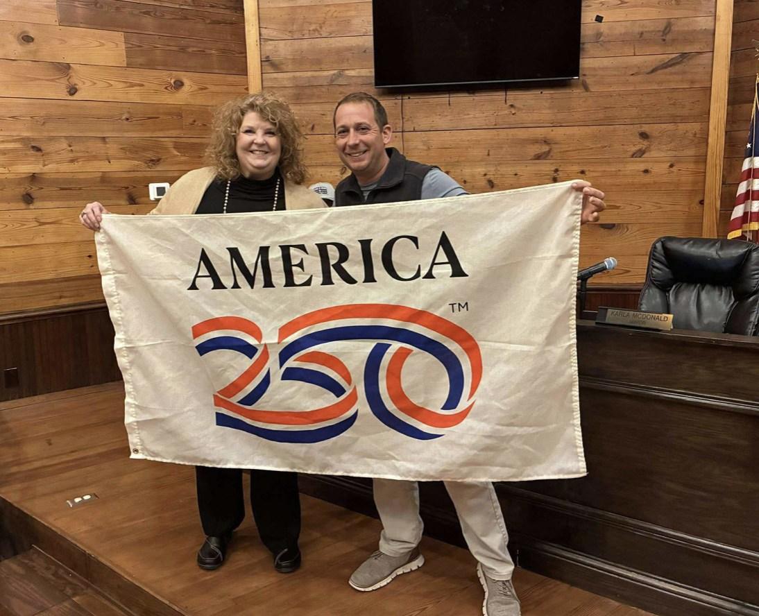 Mayor Karla McDonald accepting the “America 250” flag on behalf of the City of Howe from DustyWilliams with the Grayson County Texas– Historical Commission Photo Credit: “Howe Mayor Karla McDonald” Facebook Page