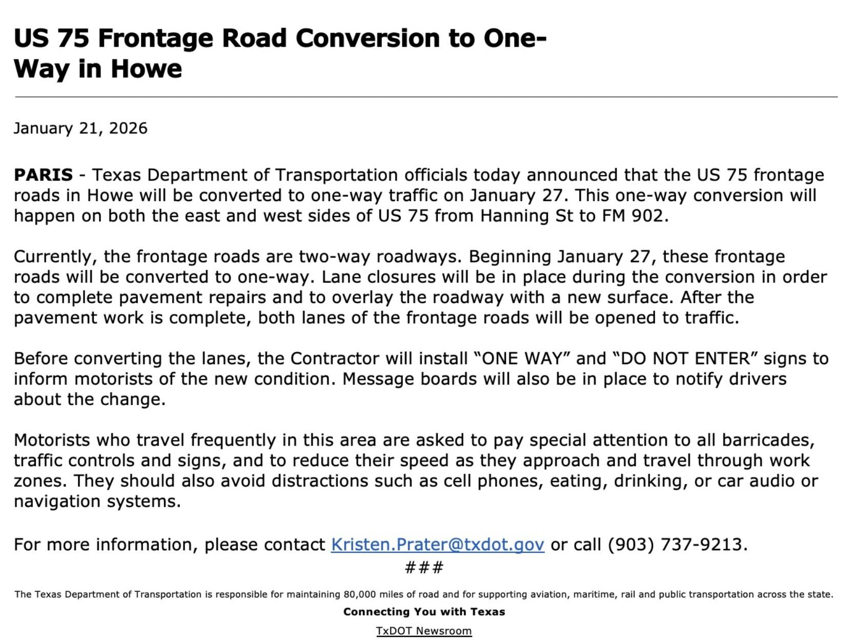 It looks like we are finally going to have some winter weather this year! Be sure to check out the “Local Events” section for more information about how to prepare. Also, don’t miss important information in that same section about upcoming changes to Highway 75 frontage roads.