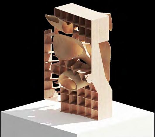 This project is an exploration of our seat in the natural environment through a water purification plant, mussel farm, and stacked housing strategy on the banks of Aspinwall, Pittsburgh. Informed and inspired by the Ennis House (1924), the building examines the spatial, formal, and temporal qualities of Frank Lloyd Wright’s concrete textile facade. Privileged views of the landscape are carved from plutonic forms raised from the ground, blurring the boundaries between shelter and landscape where neither condition can exist without the other. Continuing the steel truss logic of the Aspinwall Bridge and combining it with the extrapolated facade forms, the plutonic forms are held in a grid field which acts as support and circulation space. This system is extened over the Allegheny River as docks which engage the free flowing water. Cubic living and working quarters sit above the carved landscape where mussels and water filtering ecologies are planted to clean the adjacent river banks.
