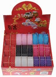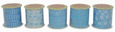 35052 , Κορδέλες πουά 2,5εκ. x2,7 μέτρα, 7 χρώματα, σταντ 24τεμ., 1,40 € /ρολό 35056, Κορδέλες βάπτισης σε 2 χρώματα, ροζ & μπλε, 1,5εκ. x 2,7μέτρα, σταντ 33τεμ., 0,80 € /τεμ. 35054, Κορδέλες summer 2,5εκ. x 2,7μέτρα, σταντ 24τεμ., 1,40 € /τεμ. 28485, Κορδέλες γαλάζιες, 5 σχέδια, 1x300εκ., συσκ. 20τεμ., 1,10 € /τεμ.