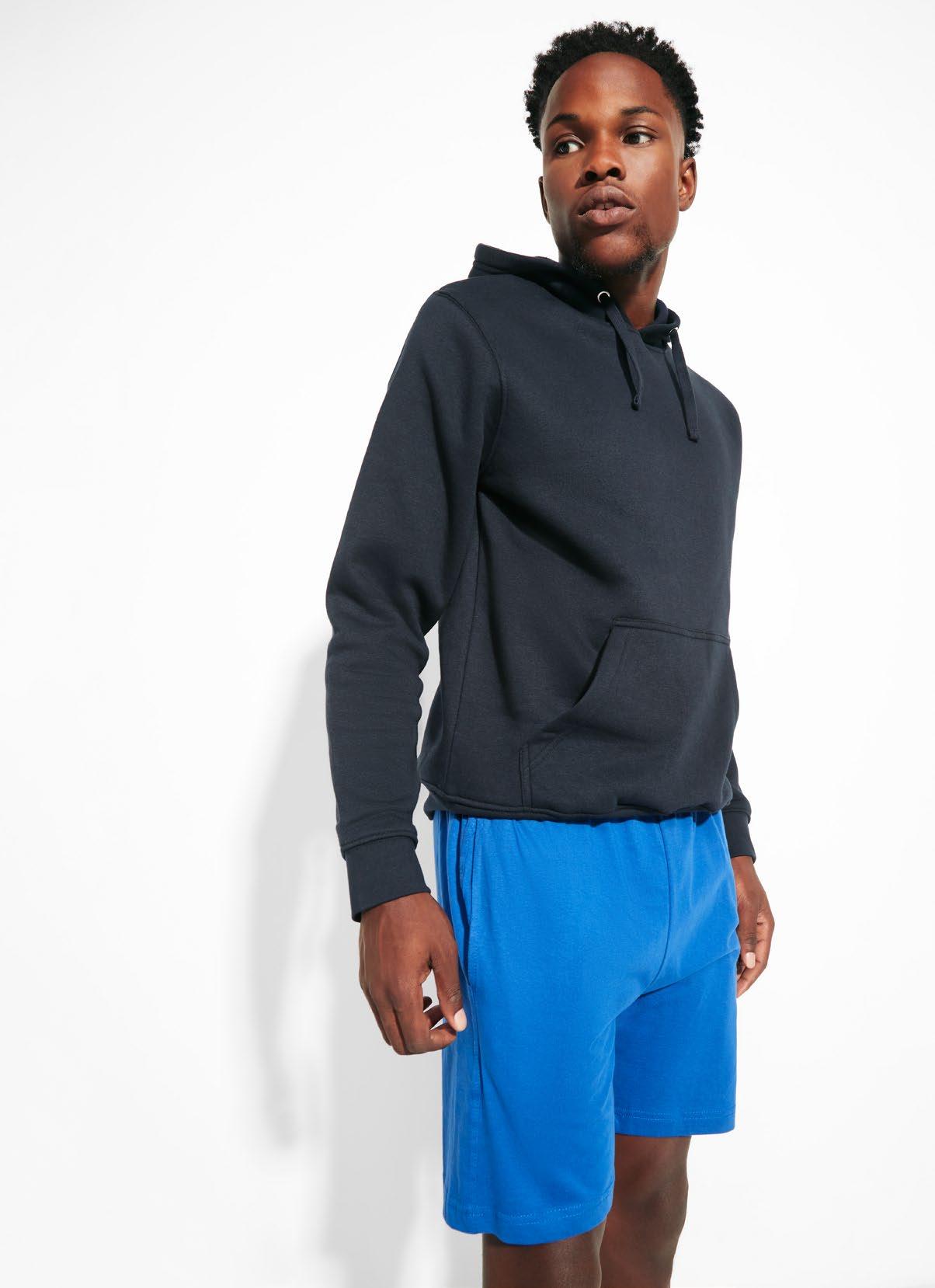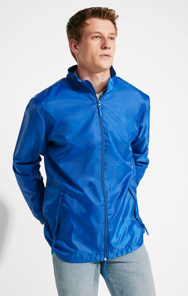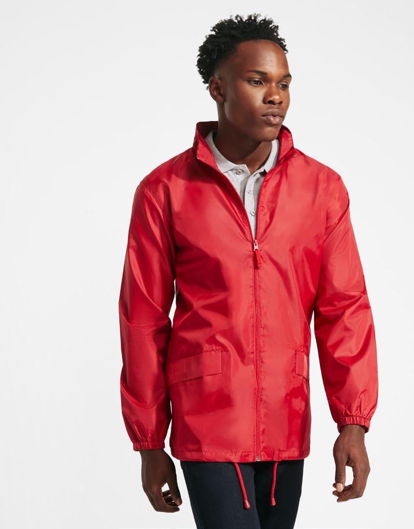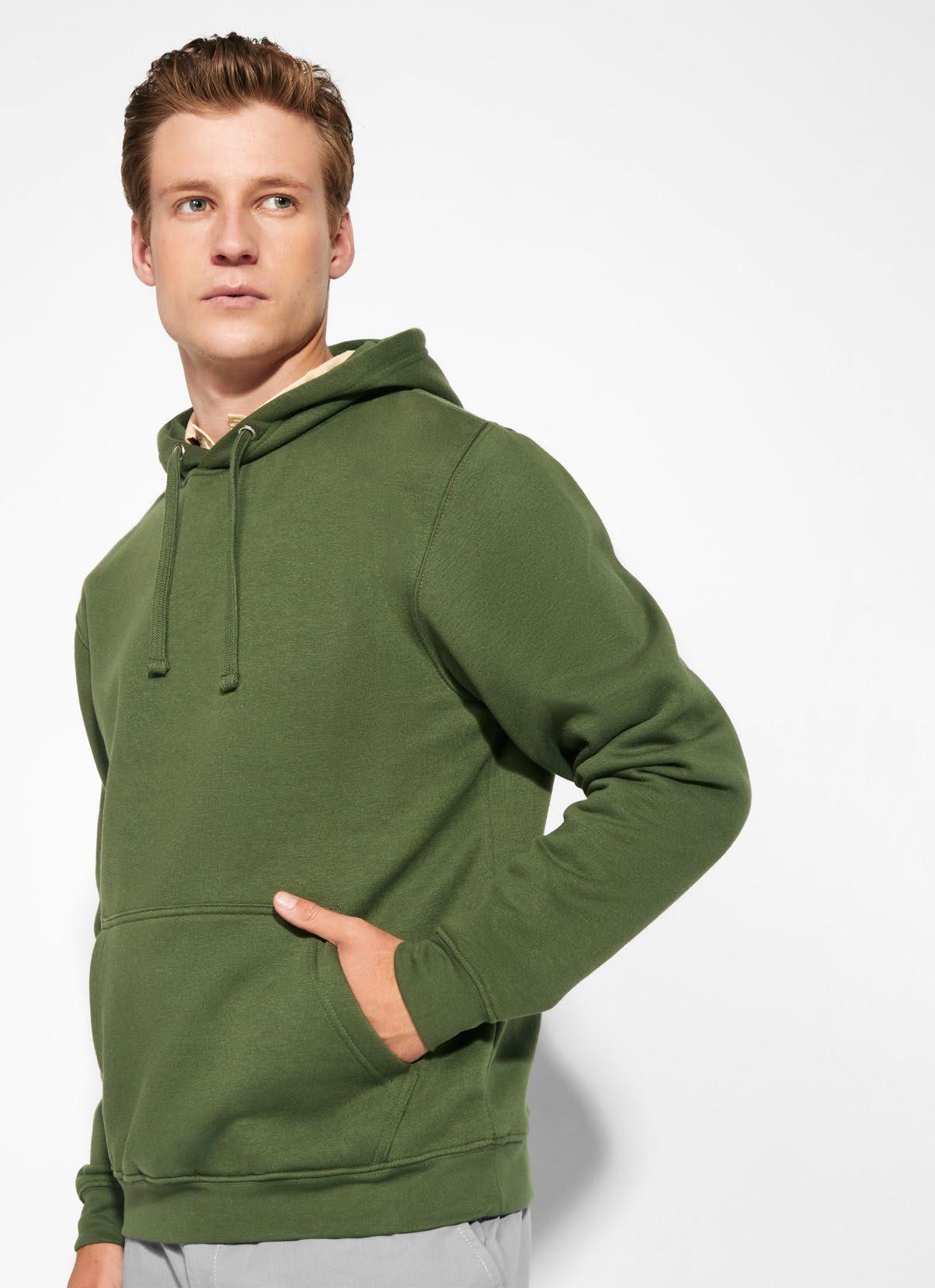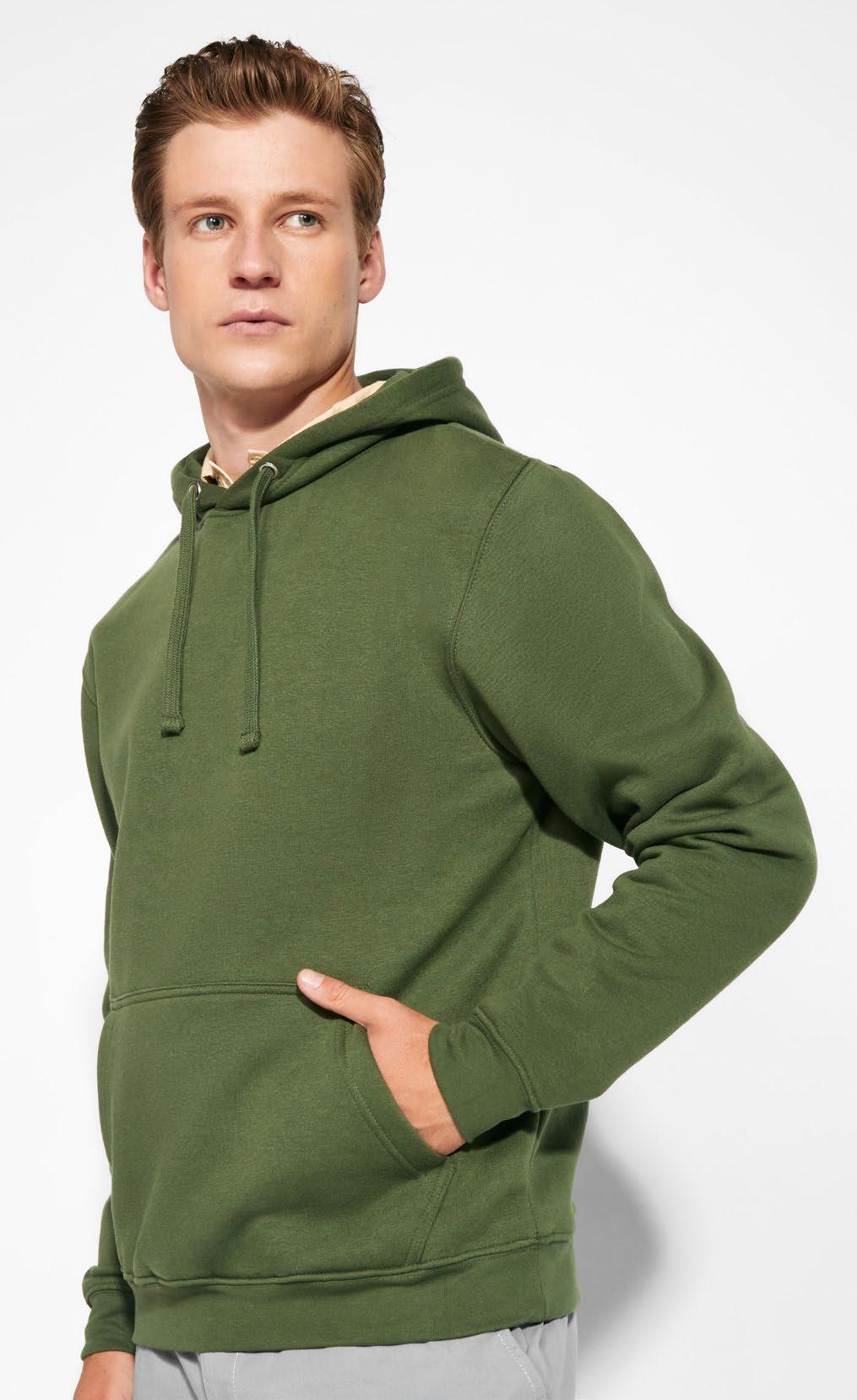 Φούτερ με κουκούλα από ελαφρύ ύφασμα. Πλισέ μονοκόμματη κουκούλα. Ραφές μπροστά, στο πλάι και στο μανίκι. Τσέπες ενσωματωμένες στις πλαϊνές ραφές. Προσαρμογέας από PVC με ελαστικό κορδόνι στη ζώνη μέσης. Ταιριαστό λογότυπο Roly στο αριστερό στρίφωμα.