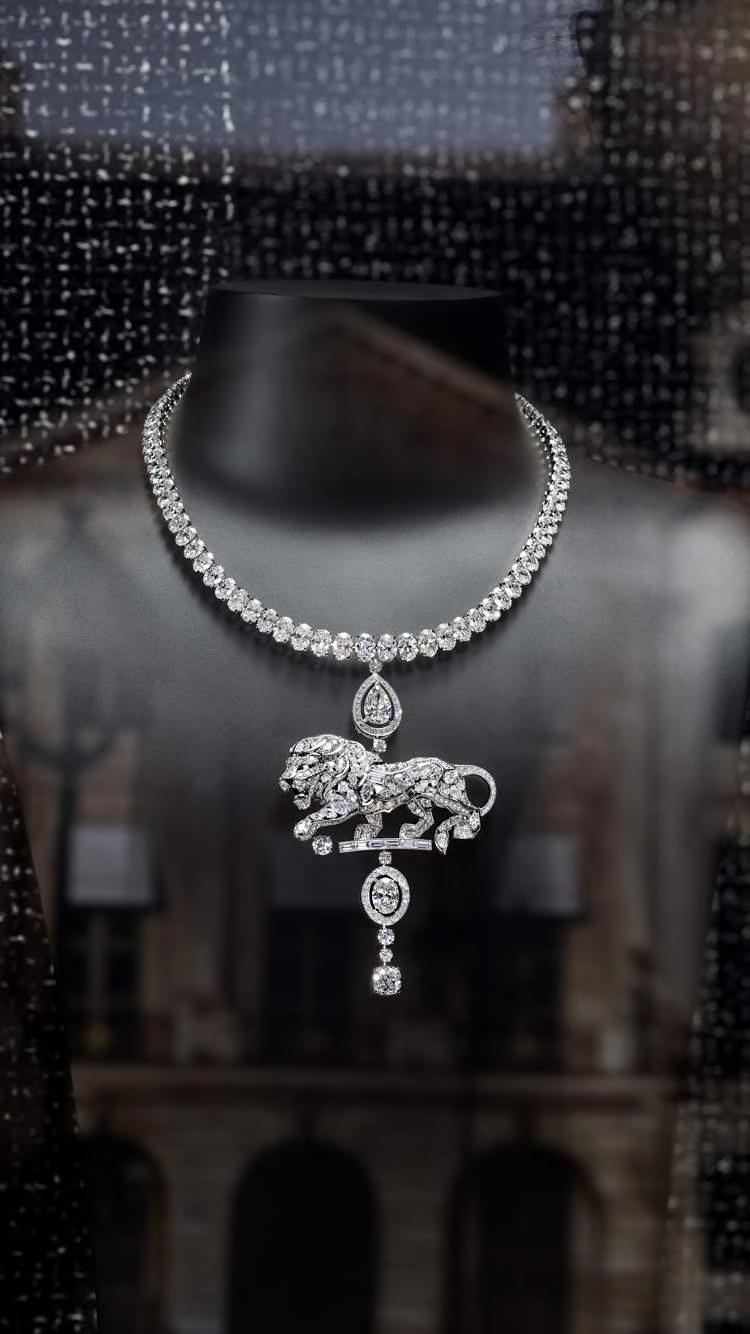 A transformable lion necklace begins with a river of diamonds encircling the neck, creating a classic style when worn on its own. The detachable lion is added for a longer, bolder necklace, the Leo sign emblazoned with diamonds, amidst a constellation of pearcut, ovalcut and cushioncut diamonds and handcrafted in 18K white gold*.