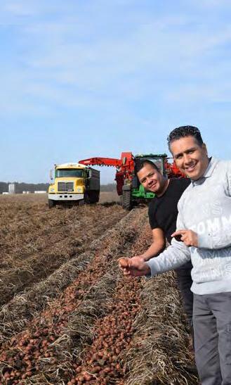 Produce buyers from Mexico got an up-close look at Coloma Farms potato harvest. In the first image, Enrique Martínez (l) and Rubén Ríos hold red potatoes grown for the Little Potato Company. In the second photo (l to r) on the harvester are Omar Arch, Enrique Martínez, Juan Carlos Díaz, Rubén Ríos, and Brenda Reyes. Peter Joyce talks to Reynaldo Santamaría at the base of the harvester.