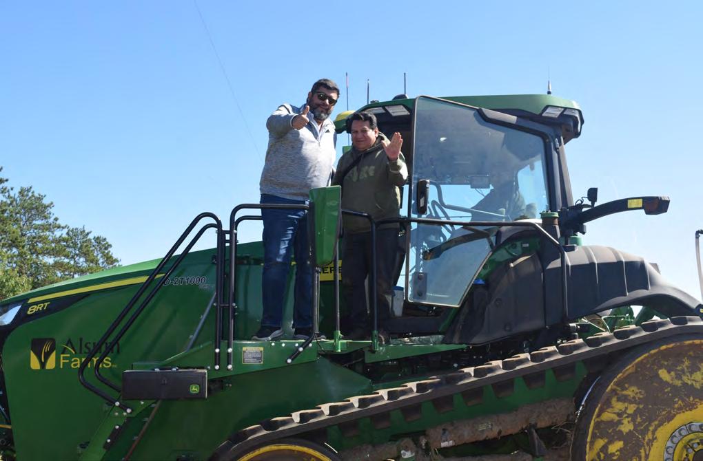 Juan Carlos Díaz (l) of Kronchis and Reynaldo Santamaría from NaturaSol took the opportunity to ride along in the tractor during potato harvest at the Alsum Farms & Produce north farm in Grand Marsh.