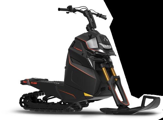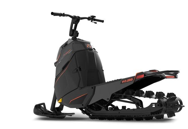 First introduced in 2023, the Widescape WS250 is a narrow, single-passenger vehicle designed for over-snow fun. Its proprietary 242cc EFI liquid-cooled 4-stroke engine sends power through a traditional CVT clutching system to a 12- by 105-inch track featuring 1.5-inch lugs. The track wraps around a single-shock rear suspension with 4 inches of travel. Up front, a 12-inch-wide single ski is connected to a dual-strut suspension with 5.5 inches of travel.