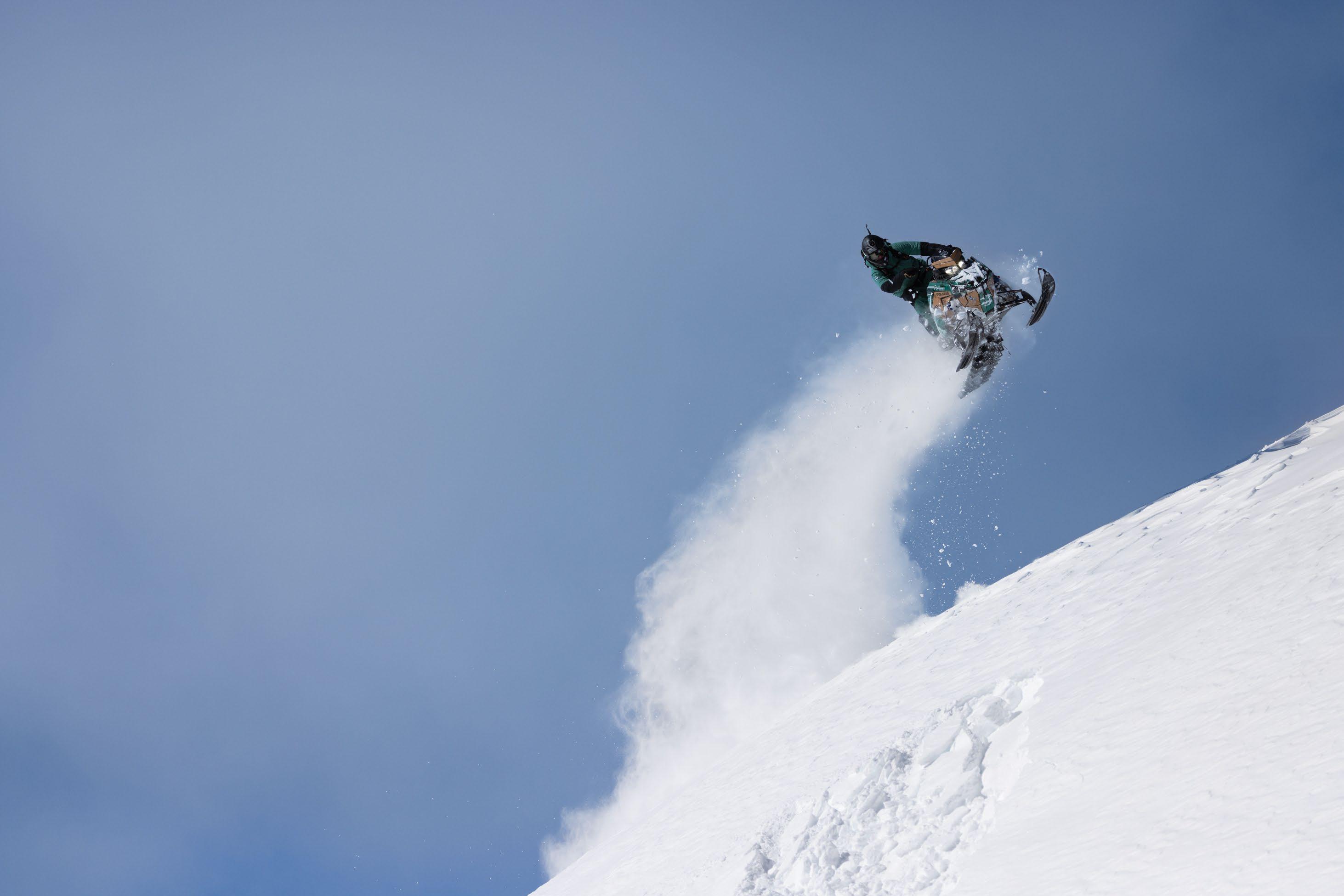 If you let off the throttle for a couple of seconds, your front end will naturally start to drop in the snow which actually gives you a little better control for turning or correcting your direction to pick your line. The more track speed you carry, the more your rear end will drop into the snow and the front end lift up.