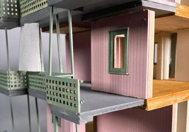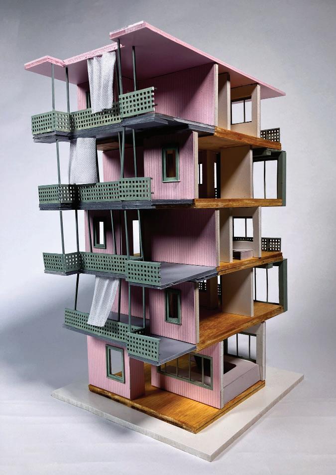 The final project is a fun and playful model that combines typical single-family typologies of the bay window, built-in furntiure, backyard and front yards, laundry lines, exterior decorations, etc. into a multi-family housing complex. The pink riveted concrete is bright and colorful and is contrasted by teal metal window pop-outs and structure.