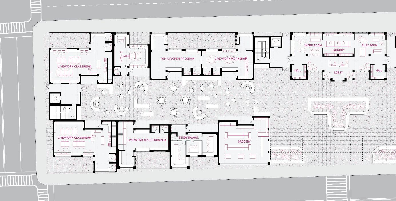 Taking the module, I created a floor plan that developed unique niches and spacial opportunities on the exterior. Creating a interior courtyard that opened to a garden/playground, I used geometric volumes at seat and desk height to develop surfaces that could be worked and played on. At the ground floor, I used room modules to create educational/child adjacent areas, as in my site research I found that the Syracuse youths were struggling in education due to cycles of intergenerational poverty due to redlining. The proposed housing project targets families with children and the community at large by providing educational opportunities.