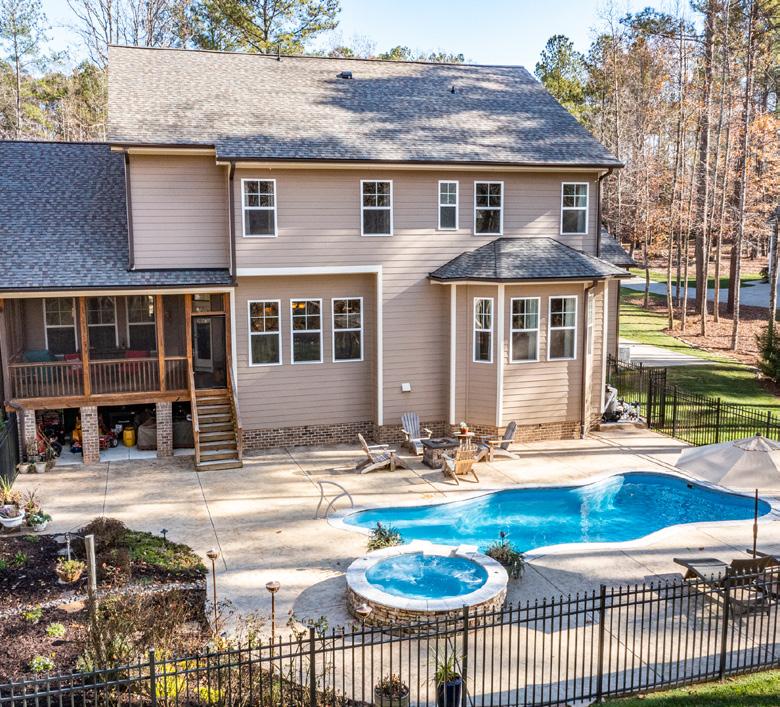 JIM ALLEN REALTOR (919) 845-9909 Info@JimAllen.com VISIT MY WEBSITE One-of-a-kind estate situated on 20.44 beautiful acres! Attention HORSE LOVERS - 10 Stall Horse Barn Shed & Riding Ring! Spend time relaxing by the Salt Water Pool with Pool House & changing rooms! Practice your putting skills on the artificial putting green. Take a friend fishing in the stocked pond or sit out on the Gazebo catching up on old times. Kitchen with wormy chestnut cabinets, gas cooktop w/center grill, double oven, Sub-Zero Fridge/Freezer, Walk-in Pantry, Cherry Wood Wine Cellar & indoor Pizza Oven. Spacious master suite with tile floors, built-in headboard w/cabinets & granite countertops. 1325 JENKINS ROAD, WAKE FOREST, NC 27587 | $2,500,000 BEDROOMS 2 BATHROOMS 3 TOTAL SQ FT 3400 MLS # 2479907