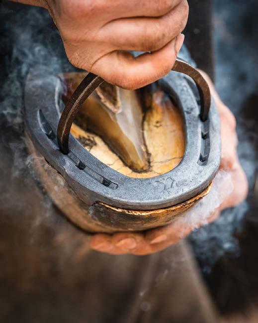 ‘Hot shoeing’ is a common practice among farriers. After the foot has been trimmed and rasped and is ready for the new shoe, the farrier heats the shoe in the forge and places it briefly on the foot to sear the path where the shoe will ultimately lie.