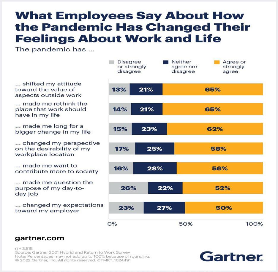 Such propensity for greater leverage in the Employment Relationship has been boosted by the phenomenon of the ‘Great Resignation’ that is giving additional ‘Food for Thought’ to the leadership within various corporate entities. The pandemic acted as a ‘wake-up call’ for a multitude of aggrieved employees as it triggered the reassessment of their priorities in terms of weighing the precariousness of their professional futures against the sacrifices being made in terms of compromising on the ‘quality’ of the time given to their loved ones/true passions. Results from a survey by Gartner encapsulate the evolving dynamics: