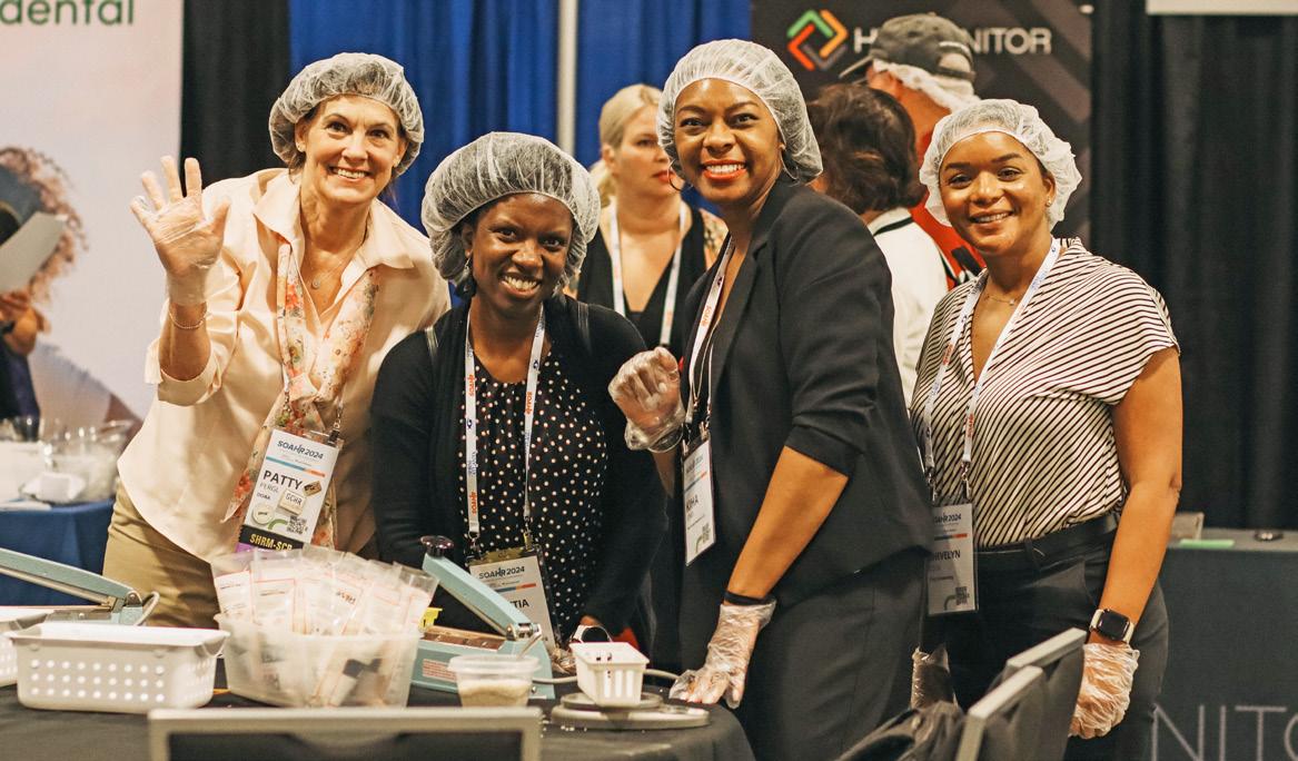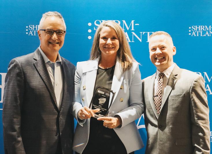 1 More than 50 volunteers helped facilitate the SOAHR conference, in which 800+ business leaders participated. 2 Winners of the HR Excellence Awards were announced at SOAHR. Pictured are (left to right): David Rubinger, publisher of the Atlanta Business Chronicle; CHRO of the Year Jill Wilson, CHRO of Carter’s; and Jason Cline, CEO of SHRM-Atlanta. SHRM-Atlanta and the Atlanta Business Chronicle jointly produce the HR Excellence Awards. 3 SHRM-Atlanta Board of Directors member Emily Best (far left) moderated a panel discussion on Beyond 9 to 5: Modern Approaches to Workforce Scheduling, featuring from left to right: Cliff Corr, Vice President of Customer Success at Feathr, which operates on a four-day workweek; Ryan Marshall, Chief of Staff at staffing technology company Nowsta; and Rosalind Tucker, Managing Director of Georgia Commute Options. 4 SHRM-Atlanta partnered with Rise Against Hunger to offer an onsite meal kit packing