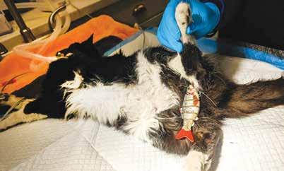 Avery small, sweet one-year-old cat, weighing just over seven pounds, arrived at the shelter as a stray in April. He had somehow become severely entangled in a large fishing lure that had three hooks on each side; those hooks had dug into not only his fur, but both hind legs too. The surgery to remove the fishing gear required some help from our maintenance department in the form of a loan of wire cutters. Some of the barbs had pierced the skin and other hooks were fully embedded, causing inflammation and, obviously, quite a lot of pain.