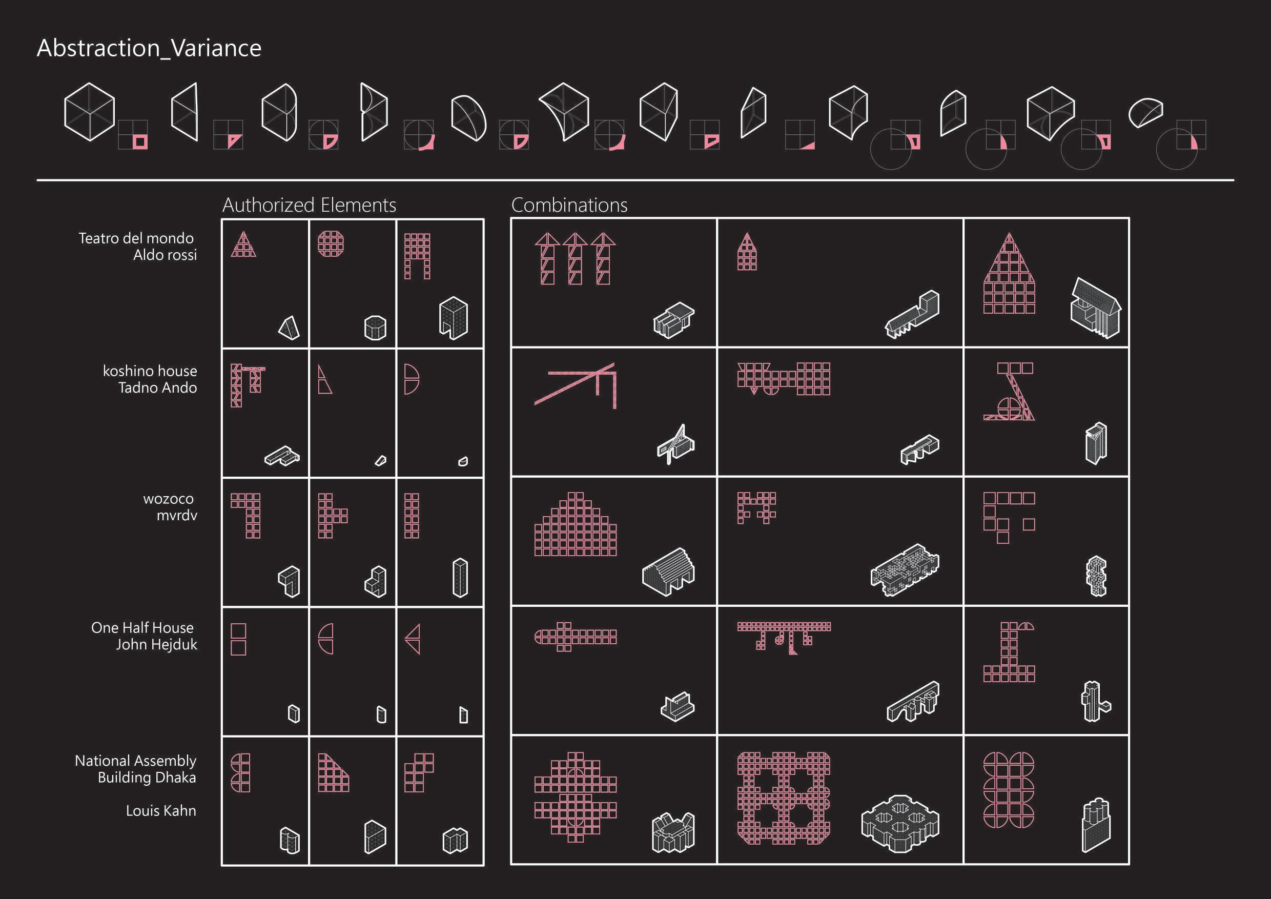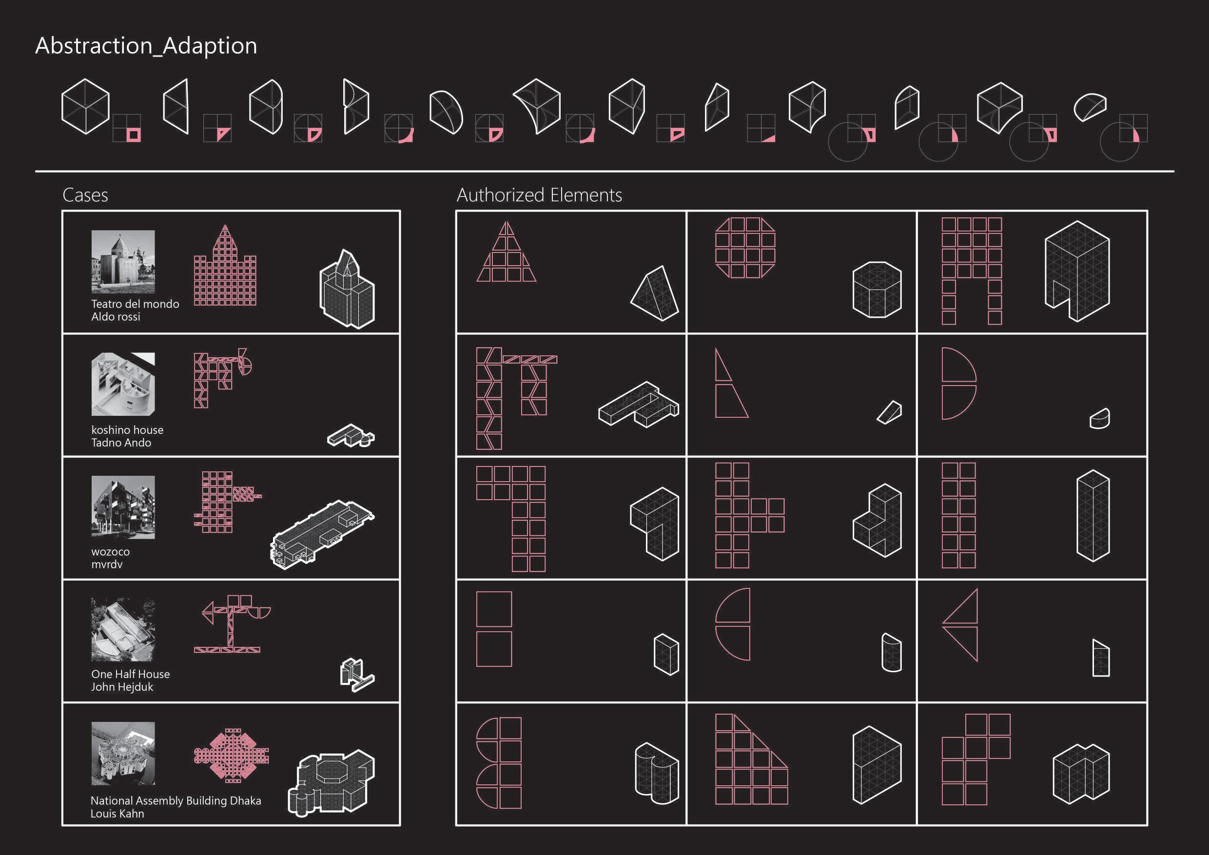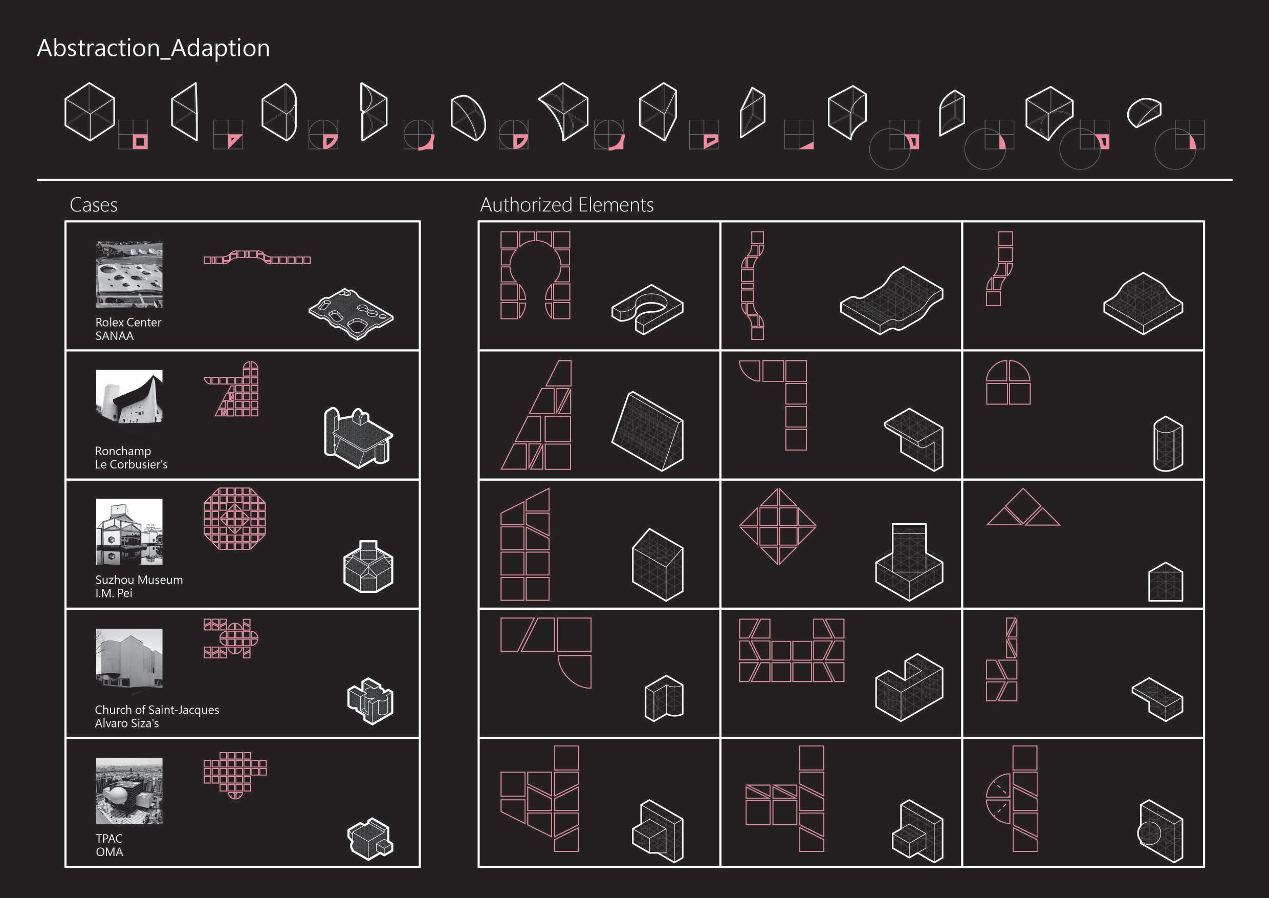 Design elements from starchitects are simplified into 12 basic elements of composition to fulfill different requirements and scenerios 12 elements are presented in truss form made from square steel tube in advance for instant support.