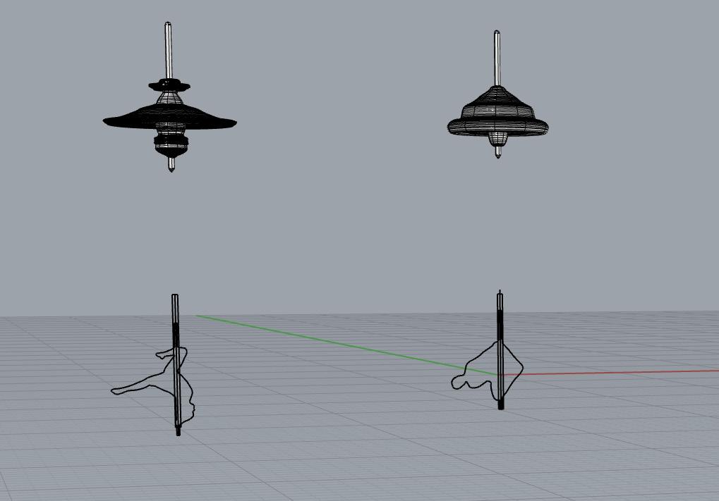 Nicht alles, was nach Kreisel aussieht, dreht sich auch. Dies war eine wichtige Erkenntnis bezüglich Funktionalität der Objekte. Für den weiterführenden Prozess habe ich mich über die physikalischen Eigenschaften von Kreiseln informiert. Grundsätzlich sollten alle Objekte drehen, die auf einer Achse und Spitze drehen und symmetrisch aufgebaut sind. Doch der Schwung, die Genauigkeit, wie sie gedreht werden und die Kraft der Bewegung hängen direkt damit zusammen, wie einfach wir die Drehbarkeit eines Kreisels empfinden. Ich habe versucht, den Schwerpunkt möglichst weit unten zu haben und die Spitze kurz zu halten. Diese Formgebung ist eine Herausforderung, da sie mit meinem Körper an der Poledance stange geformt werden muss. Die Kreisel mussten 3D-gedruckt werden, um ihre Drehbarkeit erforschen zu können. Anhand der Prototypen habe ich mich zunächst für fünf meiner Formen entschieden, um damit weiter zu arbeiten.