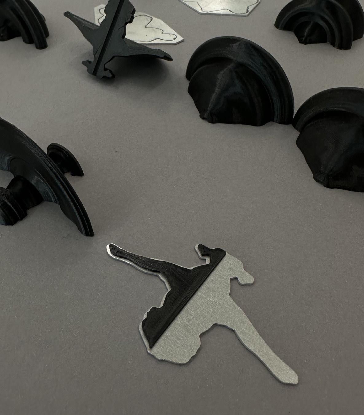 zeichnet die Silhouette ab: Das Profil ist sichtbar und wird hervorgehoben. Auf der Suche nach einem sauberen Druck ohne Naht ist mir die Idee gekommen, mich mit der Naht zu verbünden. Die 3D-Drucke mit Filament wurden als Hälften sauber gedruckt, 1mm wurde als Durchschnitt ausgespart und liess Platz für zwei Aluminiumplatten. Die Achse als Polestange wurde auch ausgespart und eine Aluminiumstange eingesetzt. Hier schliessen sich wiederum meine konzeptionellen und ästhetischen Ansprüche an die Objekte. Die Silhouette wird als Naht betont und das Profil des Körpers wird sichtbarer. Zudem ist die Polestange in Aluminium umgesetzt sehr realistisch, da sie normalerweise, wenn sie mit Chrom überzogen ist, silbern ist. Die Drehung wird mit dem glänzenden, schwarzen Filament als Volumen dargestellt und spielt in der Bewegung mit Licht und Blick.