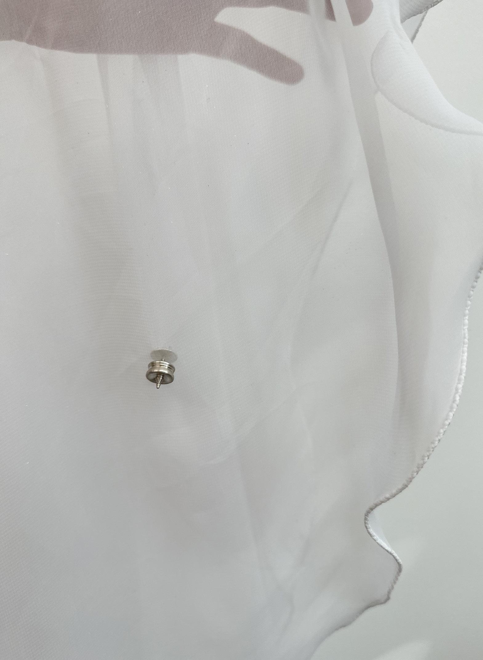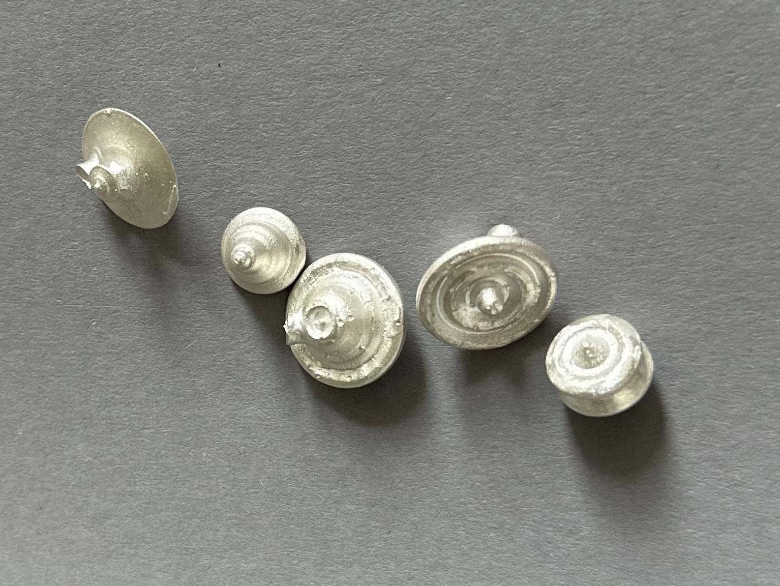 IM TEXTIL drehen sich die kleinen Pins wie die Kreisel auf dem Tisch. Mir gefällt die Adaption der Formen in noch kleinere Miniaturen. Die Kreisel spielen mit meiner Körperform als kleine, handliche Spielobjekte und die Pins sind zudem portabel. Die Pins sind aus Silber und seidenmatt verarbeitet. Es besteht eine Serie von fünf Formen.