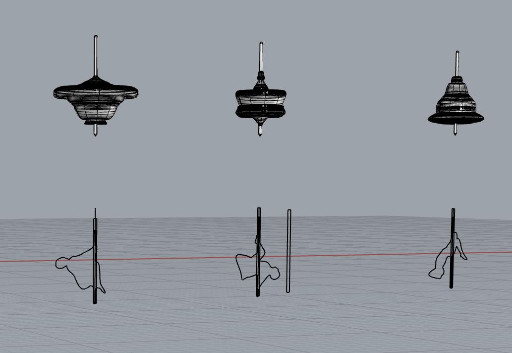 als Metapher für das Spiel mit dem Selbstbild wurde mein neues Objekt. Er bietet thematisch und Formal wunderbare neue Möglichkeiten. Beinahe jede getanzte Form zeichnet sich als kreiselähnlicher Körper ab. Unzählige Möglichketen der Formgebung können erforscht und im CAD-Programm rasch erprobt werden. Durch das Drehen der Silhouette formt sich ein neuer, abstrakter Körper. Mir gefällt die systhematische Art des Vorgehens und die damit einhergehende Abstraktion des Frauenkörpers. Die Poledancestange bekommt beim Kreisel eine Funktion: Sie ist einerseits die Drehachse und andererseits das Handstück und die Spitze des Kreisels. Konzept und Funktionalität gehen hier auf und machen mir Spass!